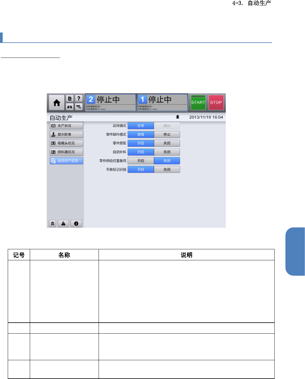 第 4 章 操作篇 可设定本机在自 动生产 时的动作。 零件缺料模式 发 生零件缺料时,选择 是否继 续生产。 如果选择[继续 ],则 即使发生错误,也不 停止生产。 停止预测零件缺 料 零件数不够完成 1 块基板的需要时,选择 是否继续生产 。 如果设为[ On ] ,将不继续自 动生产。 零件预取 选 择是否进行零件预取 。 如果设为[ On ] ,则在基板到 达前吸附零件 并待机。 自动补料 吸 嘴无法吸附零件,发 生吸附 错误时…