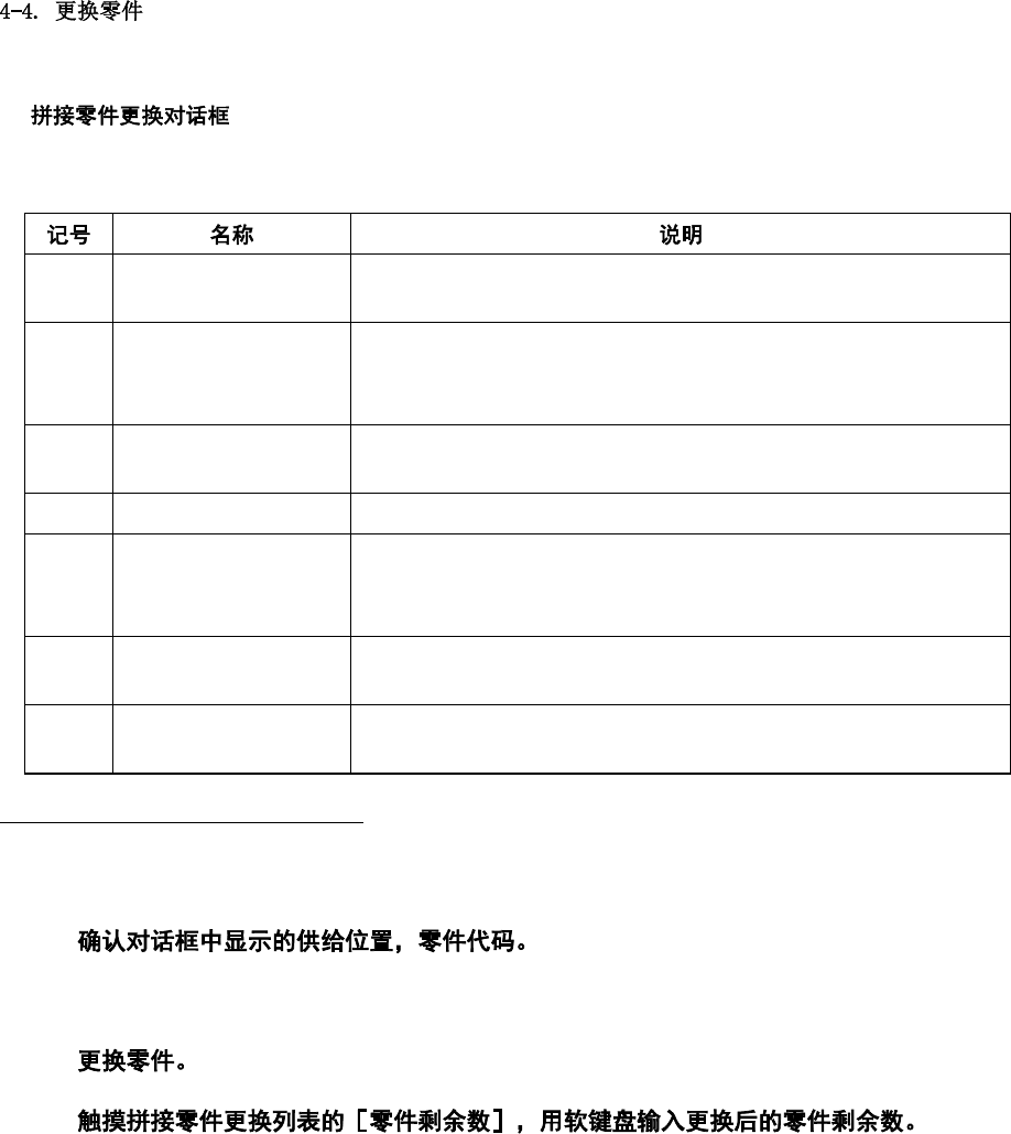 第 4 章 操作篇 4 4 返回[拼接零件更换选 择]对话框。 5 • 由于无零件更换 条形码 检查时,不检查零件 代码,因此进行拼接 零件更换时, 请事先 确认零件代码。 拼接零件更换( 设定有条形码类型时) 触摸[自动生产]画面 子菜单面板中 的[供料器状 况],显示[供料器 状况]画面, 触摸画面中的[拼 接部品更换], 显示[ 拼接零件更换选择] 对话框。 1 显示[拼接部品更换] 对话框。 2 Type C 时,确认更 换前(…