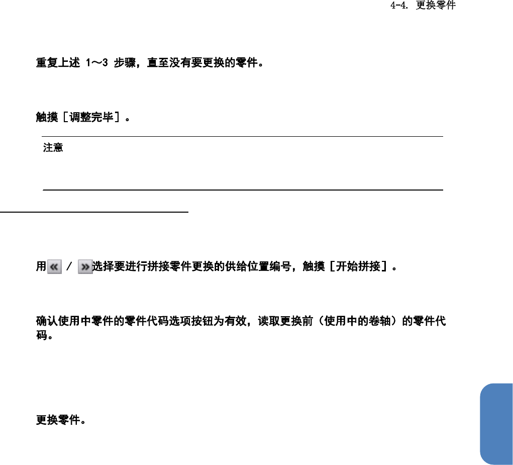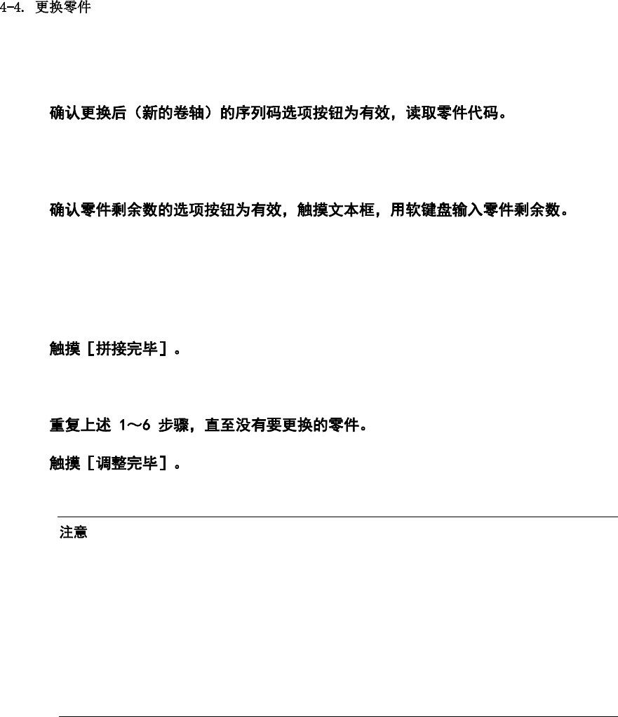 第 4 章 操作篇 4 Type C 时,确认更 换后(新的卷轴)的序 列码选 项按钮为有效,读取序列码 。 Type B , Type S 在读取零件代码时 ,还会 自动读取条形码中的 序列(随机)码。 5 还可从条形码中 读取数 值后输入。 输入的值将直接 作为零 件剩余数写入。 直接输入数值时 ,请将 执行零件更换时的零 件剩余数与更换的零 件数之和作为 零件剩余数输 入。 6 返回[拼接零件更换选 择]对话框。 7 8 关闭[拼…