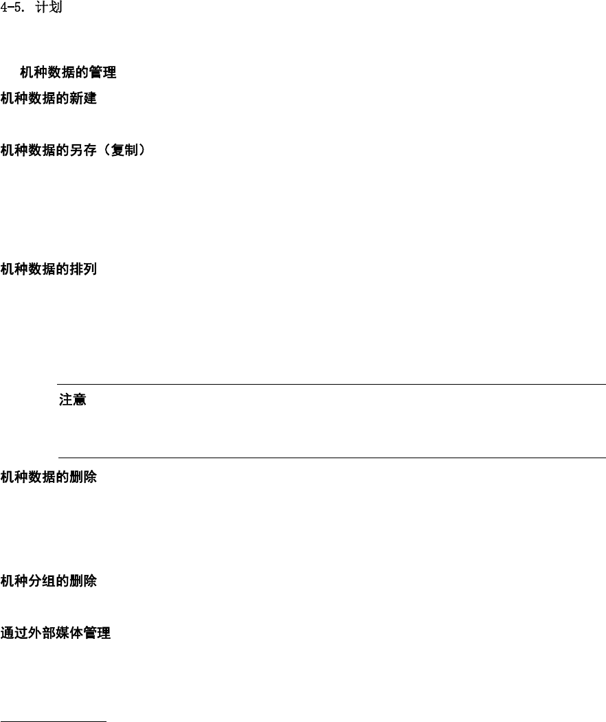 第 4 章 操作篇 n 在本机上新建机 种数据 时,机种分组名称将 作为[无分组]管理 。 机种数据另存时 ,如果 已经在相同的文件夹 中管理同一机种分组 名称,将显示 警告消息,并更改为 其他 机种分组名称后 保存。 关于机种数据名 称,即 使文件夹中已经存在 相同的机种数据名称 ,只要机种文 件名不同就可以复制 。此 外,之后还可以 更改机 种数据名称。 执行通常的单独 排列时 ,机种分组名称将作 为[无分组]管理。 利用离线数据管…