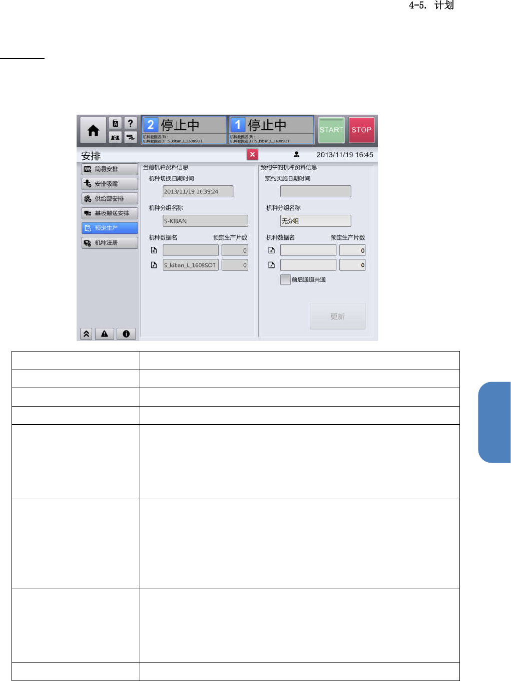 触摸[安排]画面子菜单面板中的[预定生产],显示[预定生产]画面。