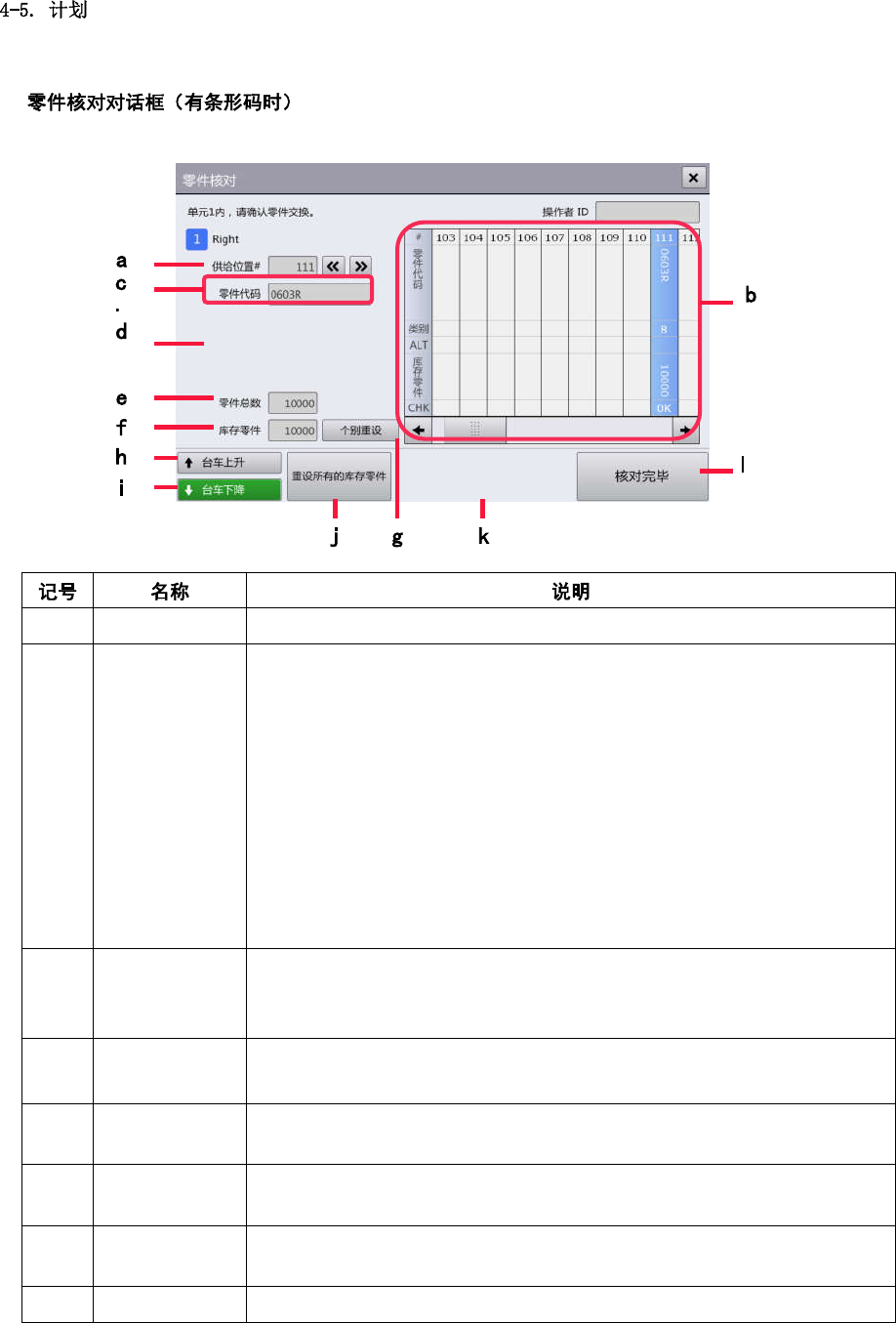 第 4 章 操作篇 4 (i) 台 车下降 触摸显示确认对 话框, 为更换台车降下操作 中的台车。 进行台车更换 后,零件核对结 果将全 部重置。 (j) 重设所有的库 存零件 重置列表中显示 的所有 供给部零件剩余数。 (k) 全 部核对完成 将机种数据中使 用的供给部强 行全部设为已 更换 (OK) 。 仅在用户级别为 [维护 ]时显示。 (l) 核 对完毕 确 认台车上升后 ,完成零件核对作业 ,关闭对话框。 带式供料器信息 核对…