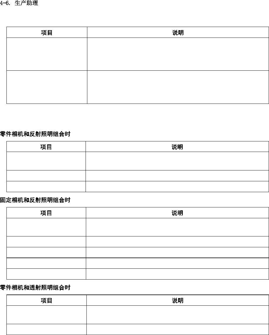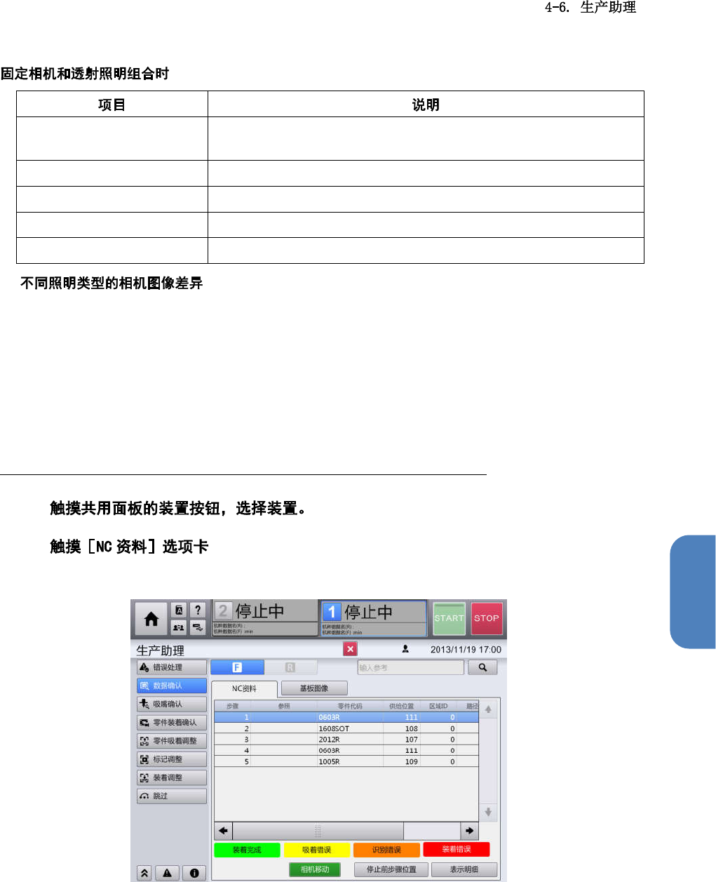 第 4 章 操作篇 使用相机 显示使用的相机。 • 零件相机:使用 零件相 机时 • 固定相机:使用 固定相 机(大视野 / 小视野)时 透射 ・ 反射 显示零件识别时的照明 方法。 • 反射:反射照明 • 透射:透射照明 根据[使用相机]和[ 透射 ・ 反射] 中选择的相机 和照明方法, 将追加显示以下项目。 各自的照明级别 显示为 0 (熄灯)到 8 (亮度最大)。 照明模式 - 亮 灯方式 显示照明的亮灯 方式。 变为[始终亮灯]…