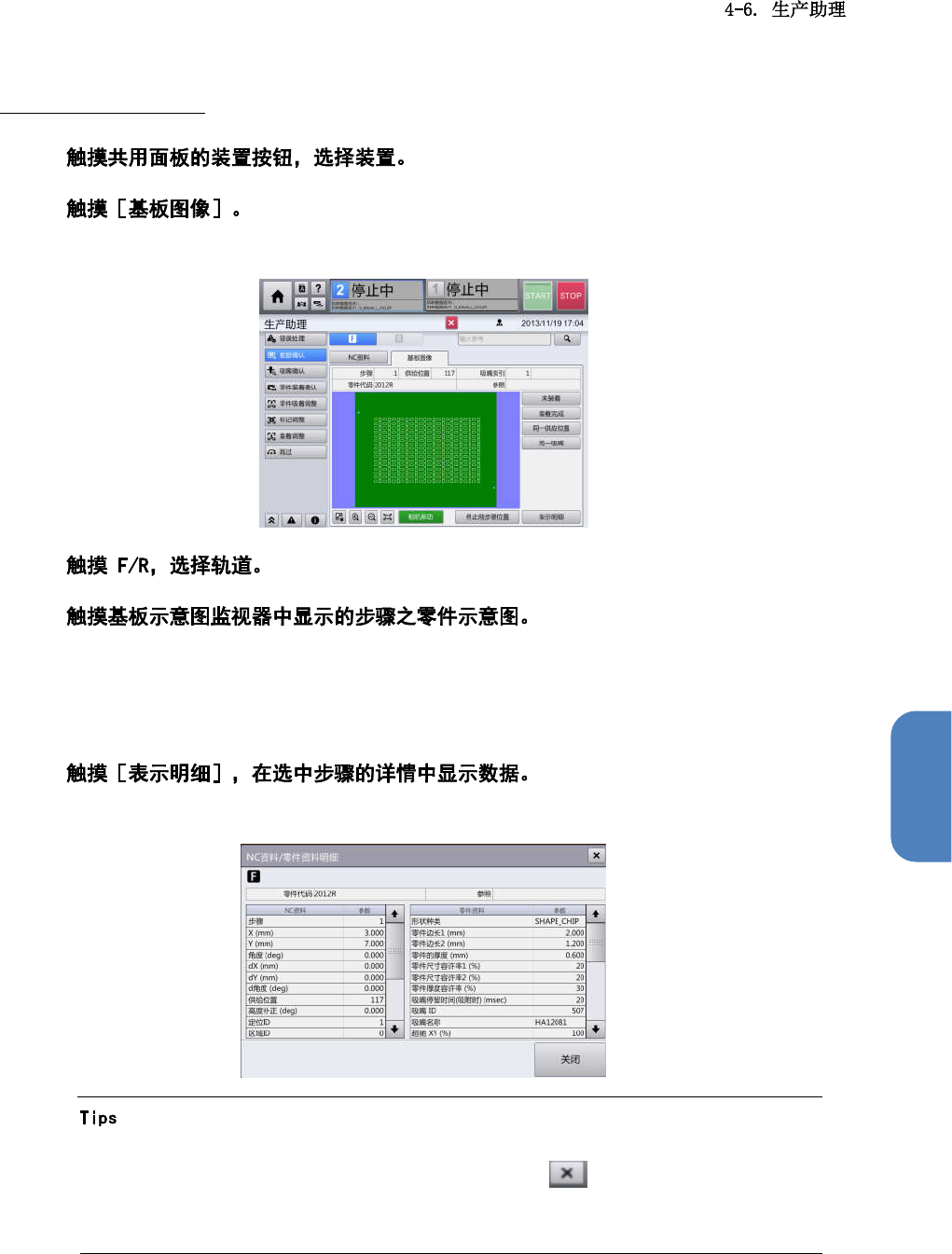 第 4 章 操作篇 4-6-3. 吸嘴确认 在吸嘴确认画面 中,可 分别进行各种确认, 如自动生产中发生 NG 吸嘴或发生零件吸附率下 降,吸附异 常时,可确认吸 嘴状态 ,吸嘴交换器的动作 ,以及吸嘴更换是否 正常。 触摸[生产助理]画面 子菜单面板中 的[吸嘴确认 ],显示[吸嘴确认 ]画面。 触摸共用面板选 择对象 装置,画面左上方将 显示选择的装置。 (a) 调 色盘 显示吸嘴头,吸嘴座, 吸嘴列 表中不同颜色的含义。 • 橙色…