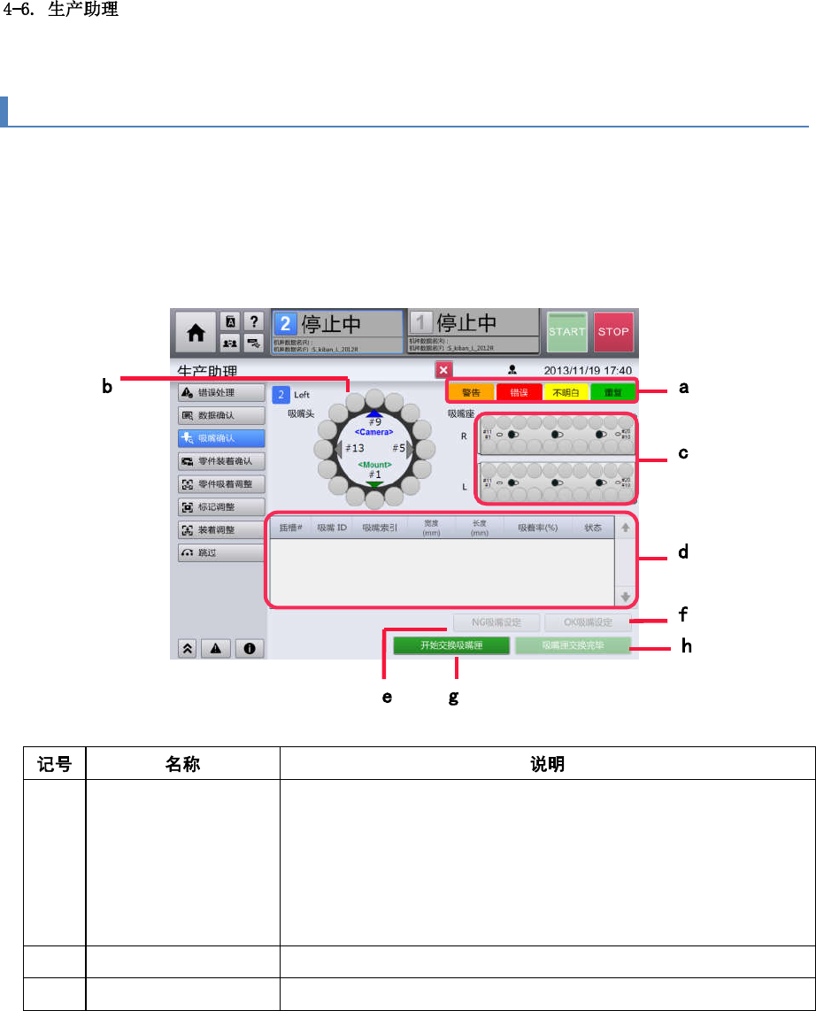 在吸嘴确认画面中,可分别进行各种确认,如自动生产中发生 NG 吸嘴或发生零件吸附率下降,吸附异