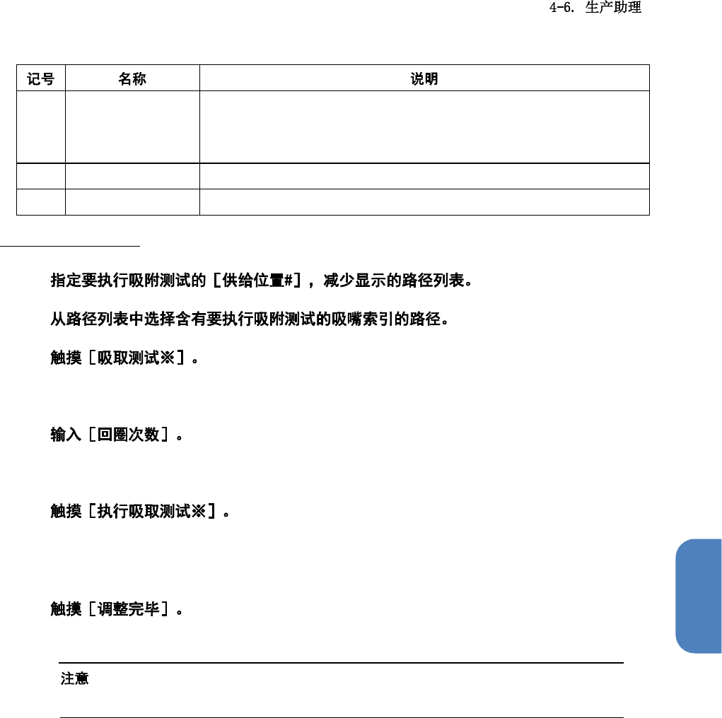 第 4 章 操作篇 4 (i) 零件教示 在 吸附零件的过程中停 止时有 效。 显示[零件教示选择 * ]对话框,可单独修 改零件识别的 数据。 (j) 结果清零 ※ 清除吸附测试结 果列表 。 (k) 调整完毕 完 成吸附测试,关闭[ 零件吸 着测试]对话框。 零件吸附画面的 操作 1 2 3 显示[零件吸着测试] 对话框。 4 以索引为单位的 吸附尝 试次数。 5 吸附测试完成后 ,测试 结果列表中将显示各 吸嘴索引的吸附率, 各种…