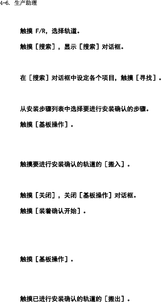 第 4 章 操作篇 2 3 有关[搜索]对话框的 详情,请参阅 下述的“搜索 对话框的详情”。 4 将在安装步骤列 表中显 示的安装步骤数据中 搜索。 5 6 显示[基板操作]对话 框。 有关[基板操作]对话 框的详情,请 参阅下述的“ 基板操作对话框的操 作”。 7 基板放置在本机 内。 8 9 显示[装着确认]对话 框,确认零件 是否正确安装 在安装位置上。未安 装零件的步骤 中将安装 零件。 有关[装着确认]对话 框的详情,请 参…