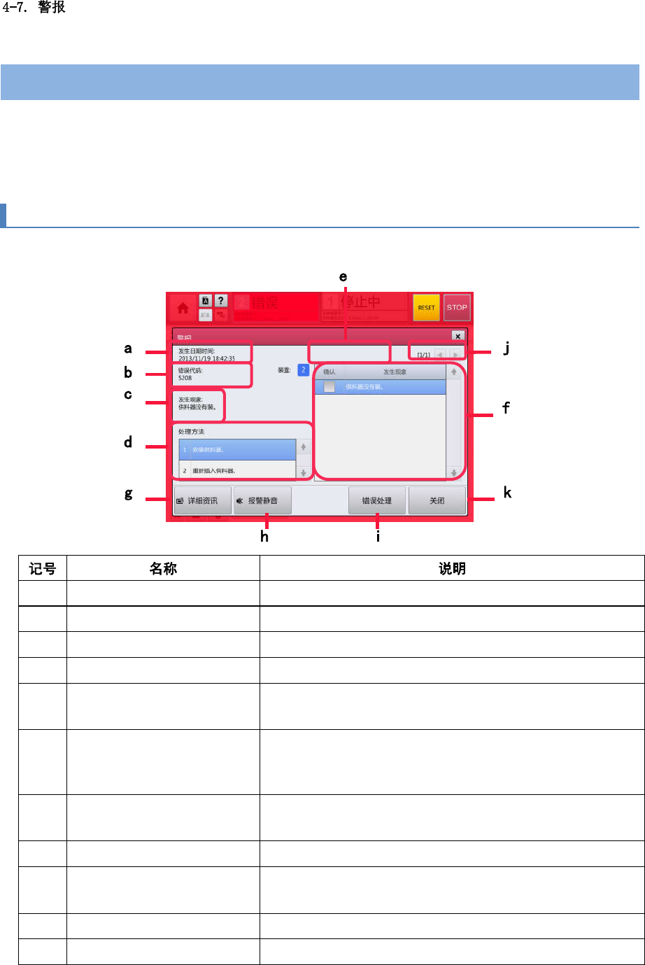 (i) 错误处理 关闭警报对话框,显示警报的处理画面。