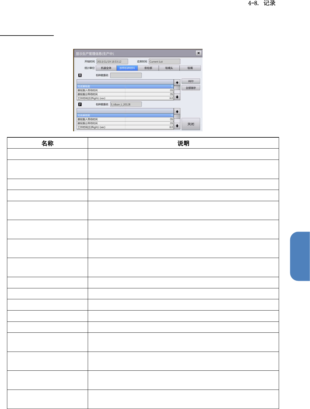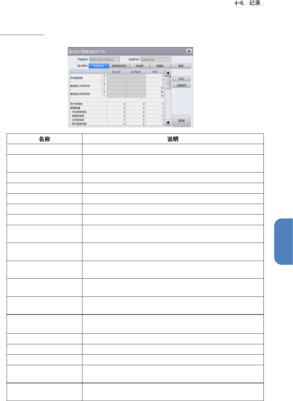 第 4 章 操作篇 基板搬送错误停 止次数 显示装置整体( 各单元 )的基板搬送错误停 止次数(因基板无法 搬 送,或检测不到 搬送结 束而停止的次数)。 吸着错误停止次 数 显示装置整体( 各单元 )的吸附错误停止次 数(因零件吸附错误 达到 设定的自动补料 次数而 停止的次数)。 零件识别错误停 止次数 显示装置整体( 各单元 )的零件识别错误停 止次数(因零件识别 错 误,或零件厚度 异常而 停止的次数)。 保养停止次数 显示装置…