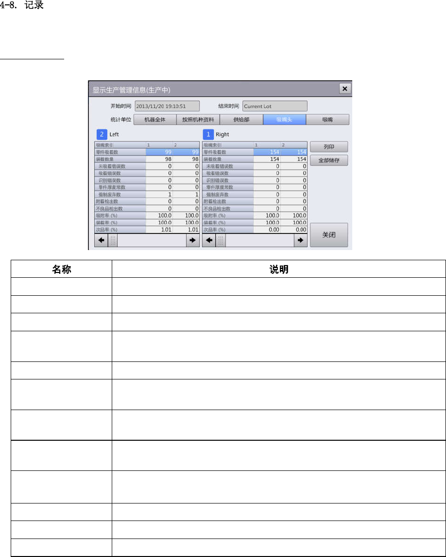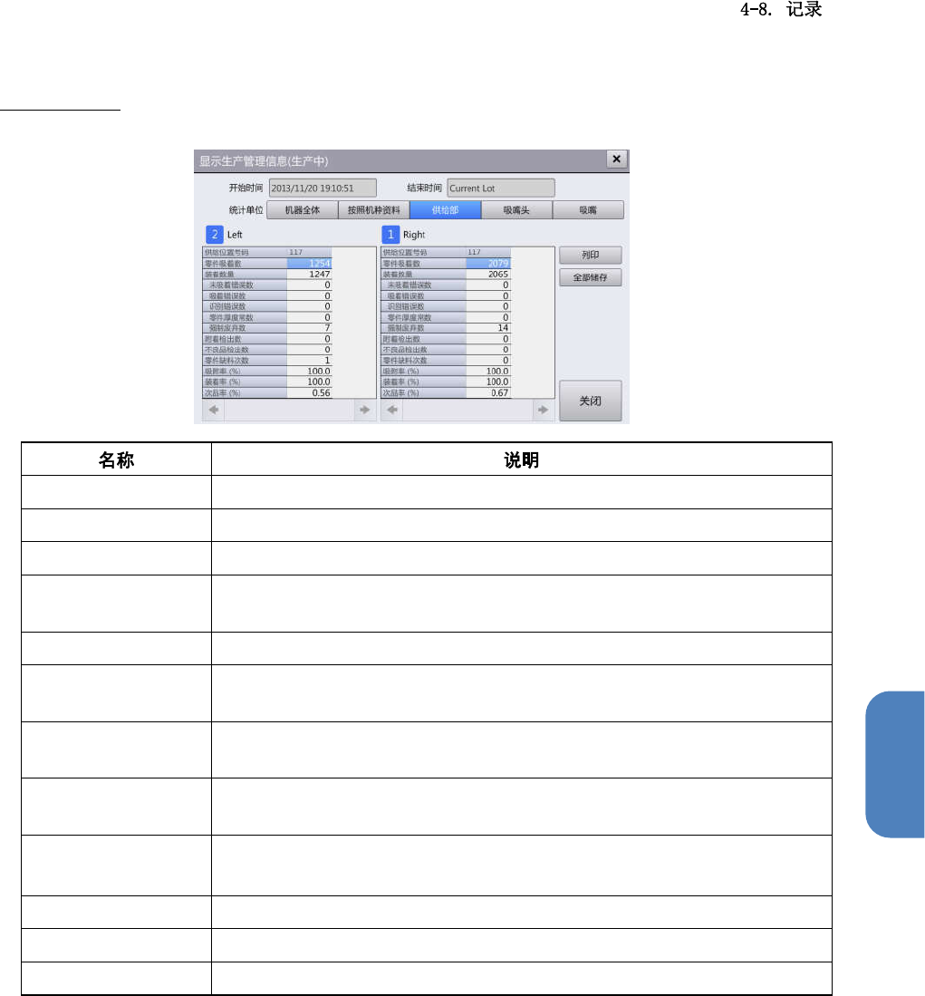 第 4 章 操作篇 4 供给部选项卡 以轨道为单位, 或者按 供给部(供给位置) 列表显示统计的生产 管理信息的详 细数据。 零件吸着数 显示装置 整体(各单元 )的零件吸附 数(零件的吸附次数 )。 装着数量 显示装置整体(各单元 )的安 装数(零件的安装次数)。 未吸着错误数 显 示装置整体( 各单元)的未 吸附错误数( 零件的吸附失败次数)。 吸着错误数 显示装置整体( 各单元 )的立式吸附错误数 (检测到零件立式吸 附的次 数)…