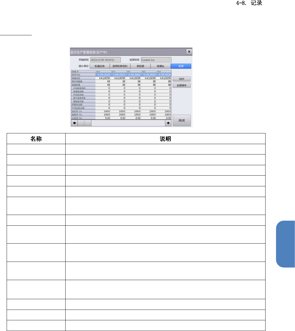 第 4 章 操作篇 吸嘴头选项卡 以单元为单位, 或按吸 嘴头中的吸嘴索引列 表显示统计的生产管 理信息的详细 数据。 零件吸着数 显示装置整体( 各单元 )的零件吸附数(零 件的吸附次数)。 装着数量 显示装置整体(各单元 )的安 装数(零件的安装次数)。 未吸着错误数 显示装置 整体(各单元 )的未吸附错 误数(零件的吸附失 败次数)。 吸着错误数 显示装置整体( 各单元 )的立式吸附错误数 (检测到零件立式吸 附的次 数)。 识别…