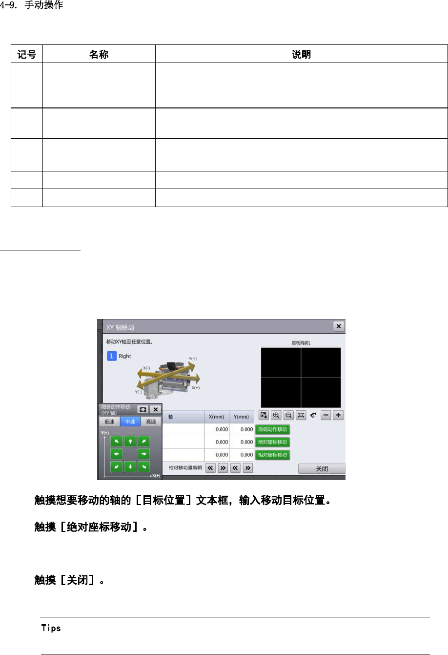 第 4 章 操作篇 4 各轴的动作方向 如下所 示。 X 轴 左右 左 右 Y 轴 前后 后 前 Z 轴 上下 下 上 吸嘴 RN 轴 旋转 逆时针 顺时针 旋转座 RT 轴 旋转 逆时针 顺时针 H 轴 上下 下 上 • 轴移动时的移动 方向为 从本机正面看的移动 方向。 • 轴旋转时的旋转 方向为 从本机正上方看的旋 转方向。 轴的移动分为绝 对移动 ,相对移动,微调移 动 3 种。 • 绝对移动:移动 到以各 轴原点为基准的目标 …