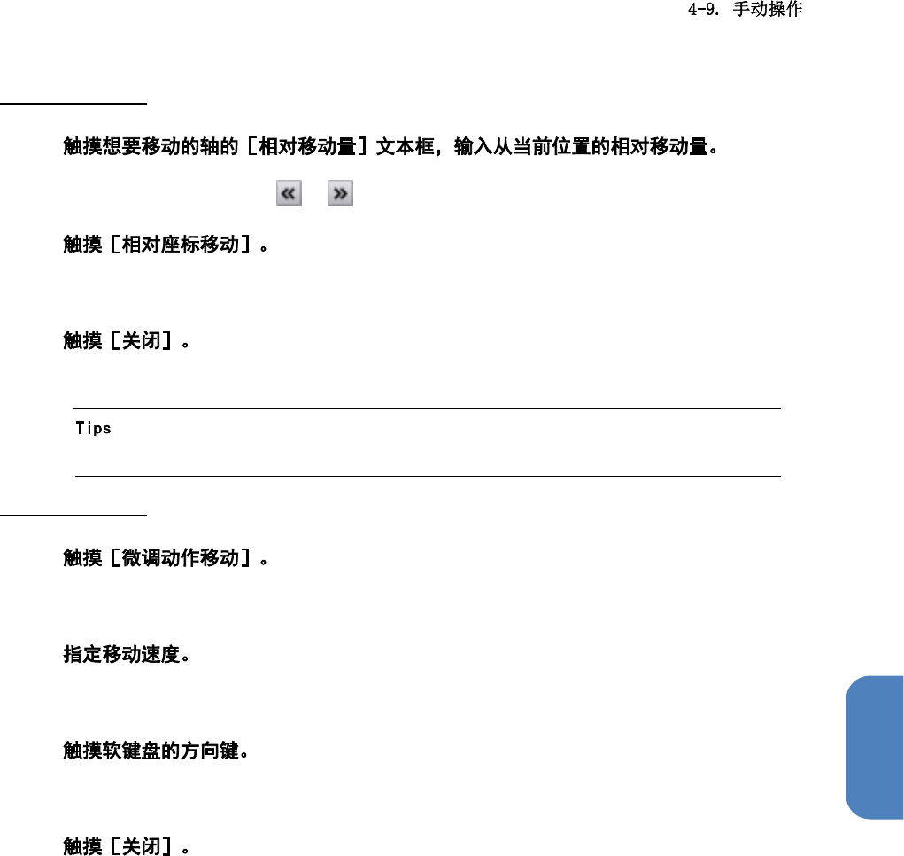 第 4 章 操作篇 4 XY 轴的相对移动 1 触摸[相对移动量编辑 ]的 / ,可增减移动量 。 2 XY 轴将从当 前位置按[相对 移动量]中指 定的距离移动。 3 关闭对话框,返 回吸嘴 头操作画面。 • 轴动作过程中无 法操作 画面。 XY 轴的微调移动 1 显示微调移动的 软键盘 。 2 触摸[低速],[中速 ],[高速] 中的任意一个 。 3 XY 轴将向触 摸的方向键方向 移动。 4 关闭对话框,返 回吸嘴 头操作画面。 …