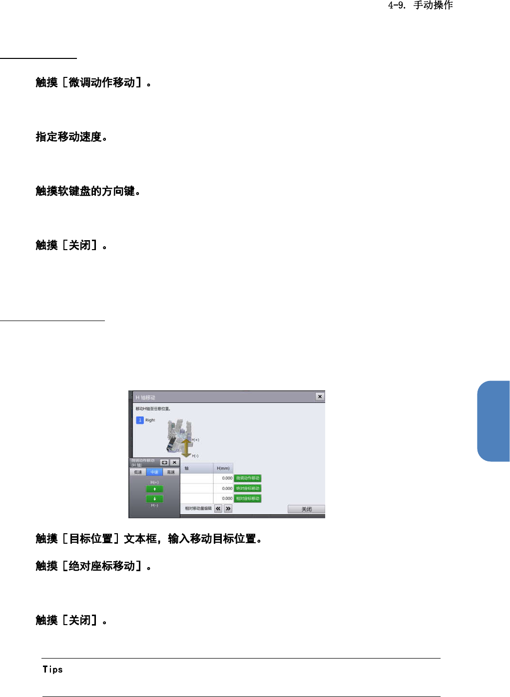第 4 章 操作篇 Z 轴的绝对移动 触摸吸嘴头操作 画面的 [ Z ],显示[ Z 轴移动] 对话框。 可将整个吸嘴头 移动到 上下( Z 轴)任意位置。 [位置资讯]的 [现在 位置]中将显示 Z 轴的当前位置 。 1 2 Z 轴将移动到[目标位 置]中指定的 位置。 3 关闭对话框,返 回吸嘴 头操作画面。 • 轴动作过程中无 法操作 画面。 Z 轴的相对移动 1 触摸[相对移动量编辑 ]的 / ,可增减移动量 。 2 Z 轴将从…