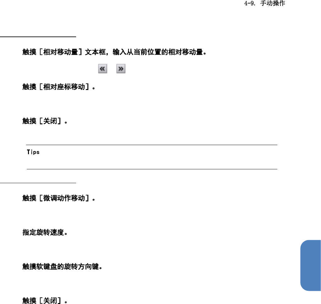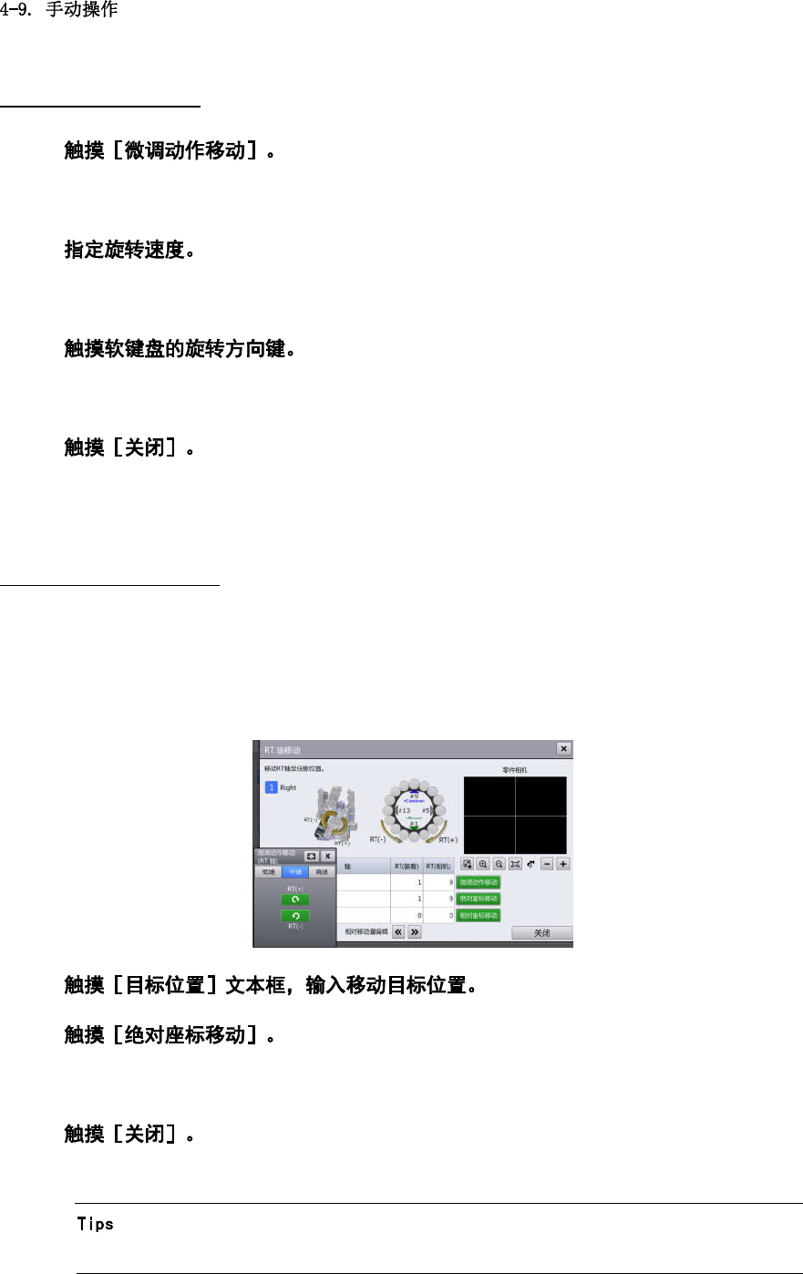 第 4 章 操作篇 4 旋转座 RT 轴的相对移 动 1 触摸[相对移动量编辑 ]的 / ,可增减移动量 。 2 RT 轴将旋转 至[相对移动量 ]中指定的位 置。 3 关闭对话框,返 回吸嘴 头操作画面。 • 轴动作过程中无 法操作 画面。 旋转座 RT 轴的微调移 动 1 显示微调移动的 软键盘 。 2 触摸[低速],[中速 ],[高速] 中的任意一个 。 3 RT 轴将向触 摸的方向键方向 旋转。 4 关闭对话框,返 回吸嘴 头操…