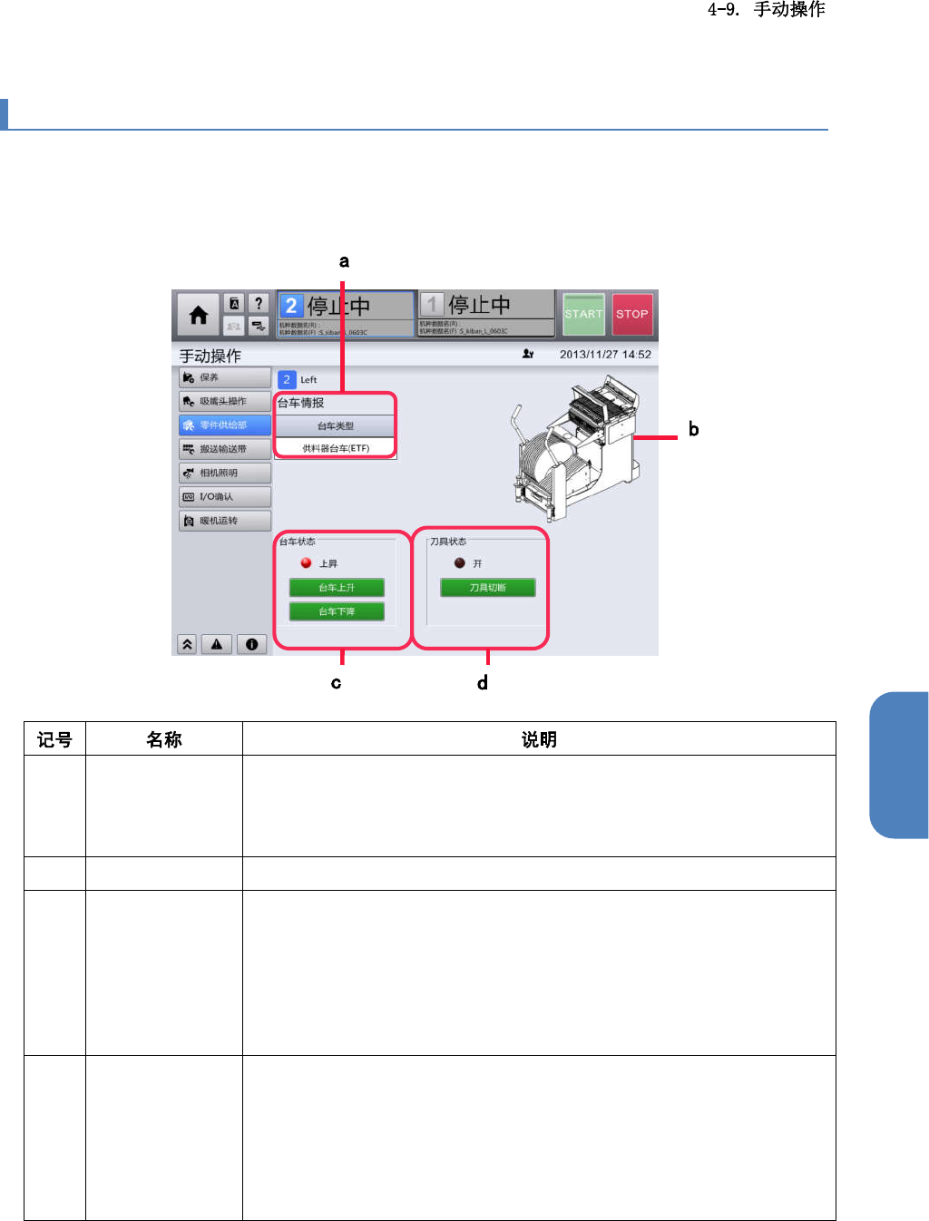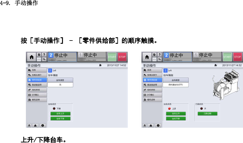 第 4 章 操作篇 1 2 • 上升台车:触摸 [台车 上升]。 • 下降台车:触摸 [台车 下降]。 150