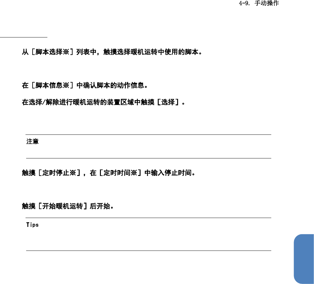 第 4 章 操作篇 4 暖机运转的方法 1 选择的暖机运转 脚本名 称将变为蓝色选中状 态。 2 3 显示在[脚本选 择※] 中选择的脚本名称, 并设置为用于暖机运 转。 触摸[解除],取消脚 本的选择。 • 暖机运转为各个 装置分 别进行,因此左右装 置请分别选择不同的 脚本。 4 触摸[不停止※],将 在触摸[ STOP ]前一直暖机运转。 5 • 触摸[解除]取消脚本 的选择时,请 从[脚本选择※]列 表中重新选择 脚本。 • 如…