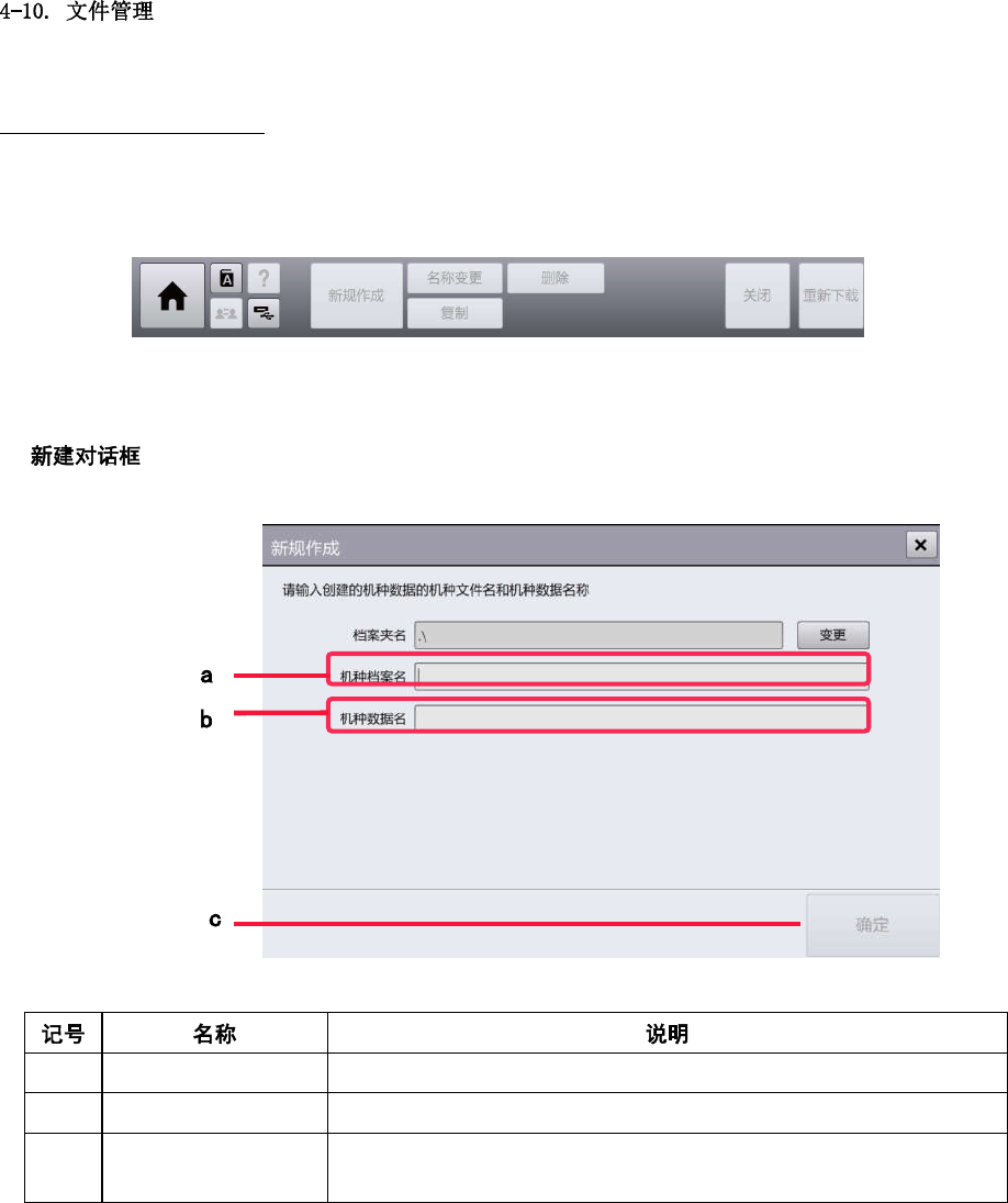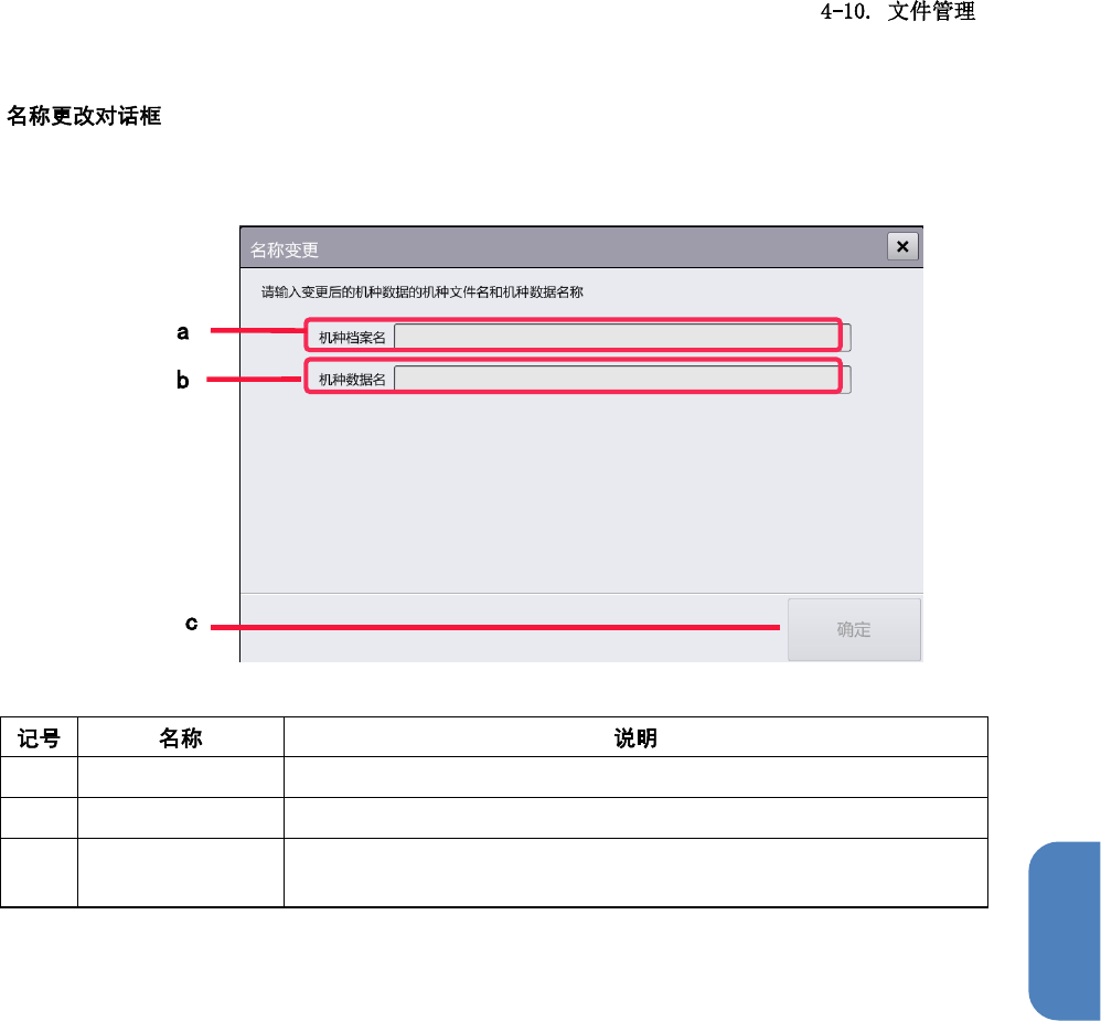 第 4 章 操作篇 4 n 更改选中机种文 件的机 种文件名及机种数据 名称。机种分组名称 无法更改。 (a) 机种档案 名 输入机种数据的 [机种 档案名]。 (b) 机种数据 名 输入机种数据的 [机种 数据名]。 (c) 确定 反映前一画面中 选中机 种数据的[机种数据 名]及[机种档案名 ]的 更改,然后关机 对话框 。 165