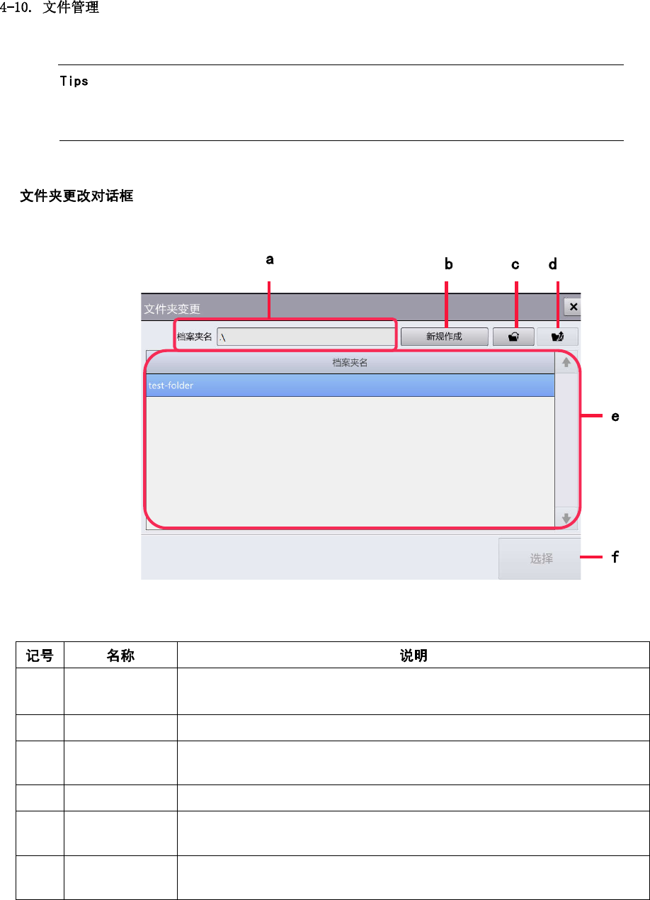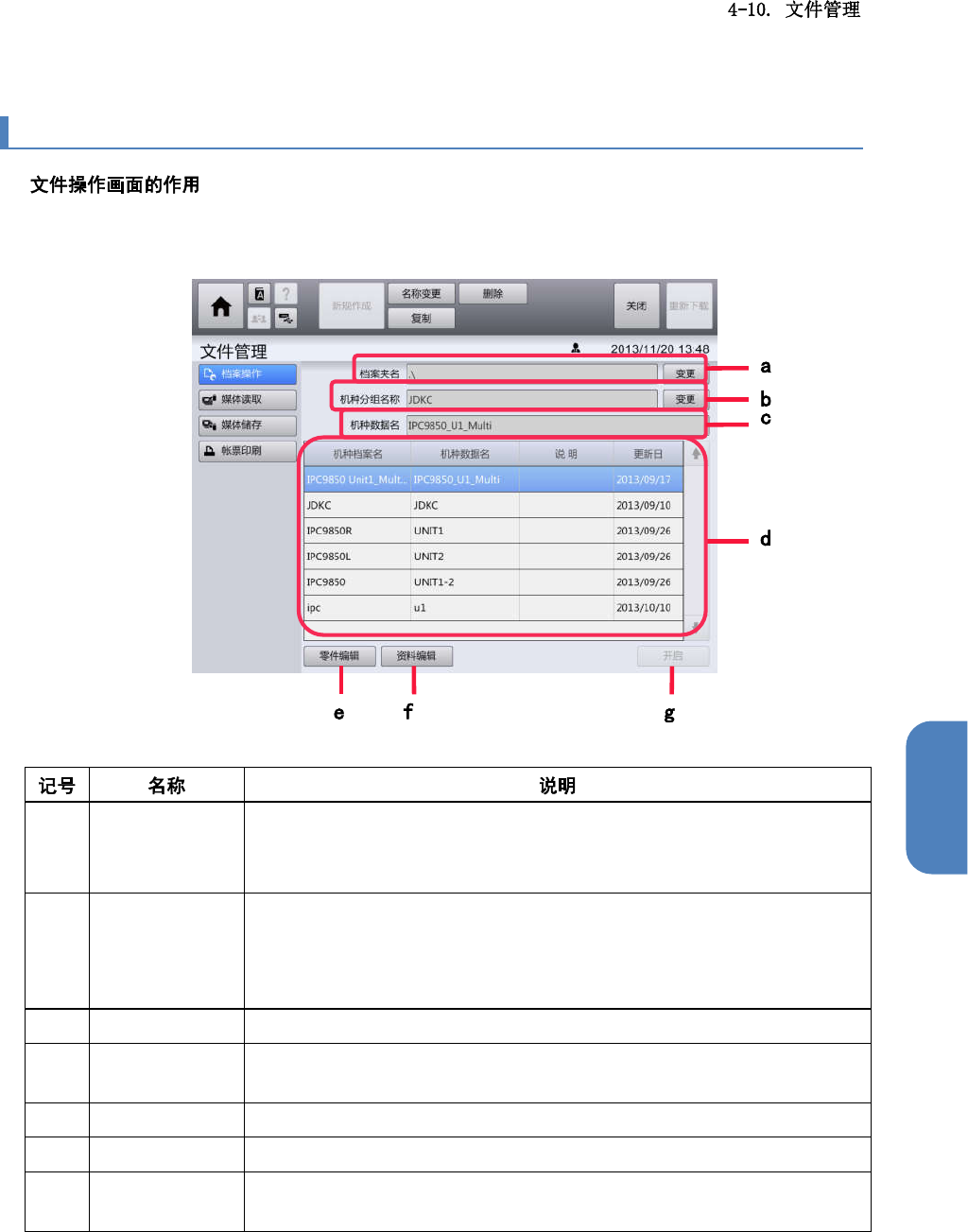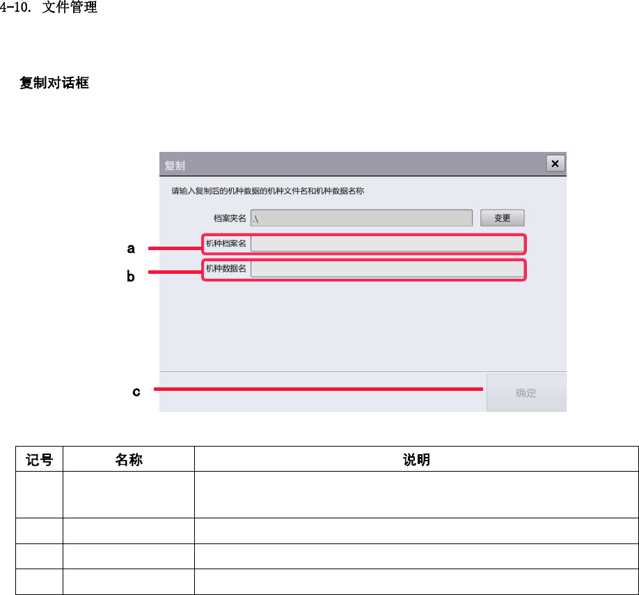 第 4 章 操作篇 4 4-10-2. 文件操作 n 在文件操作画面 中,对 数据编辑中处理的文 件输入进行管理。可 选择对象数据 后编辑。 触摸[机种资料管理] 子菜单面板中 的[档案操作 ]后显示。 (a) 档 案夹名 显示保存 机种数据的文 件夹名称。 触摸[变更]显 示[文件夹变更]对 话框,可更改 文件夹名称。 关于[文件夹变更]对 话框的详情, 请参阅下述的 “文件夹更改对话框 ” (b) 机 种分组名称 显示机种数据的 机…