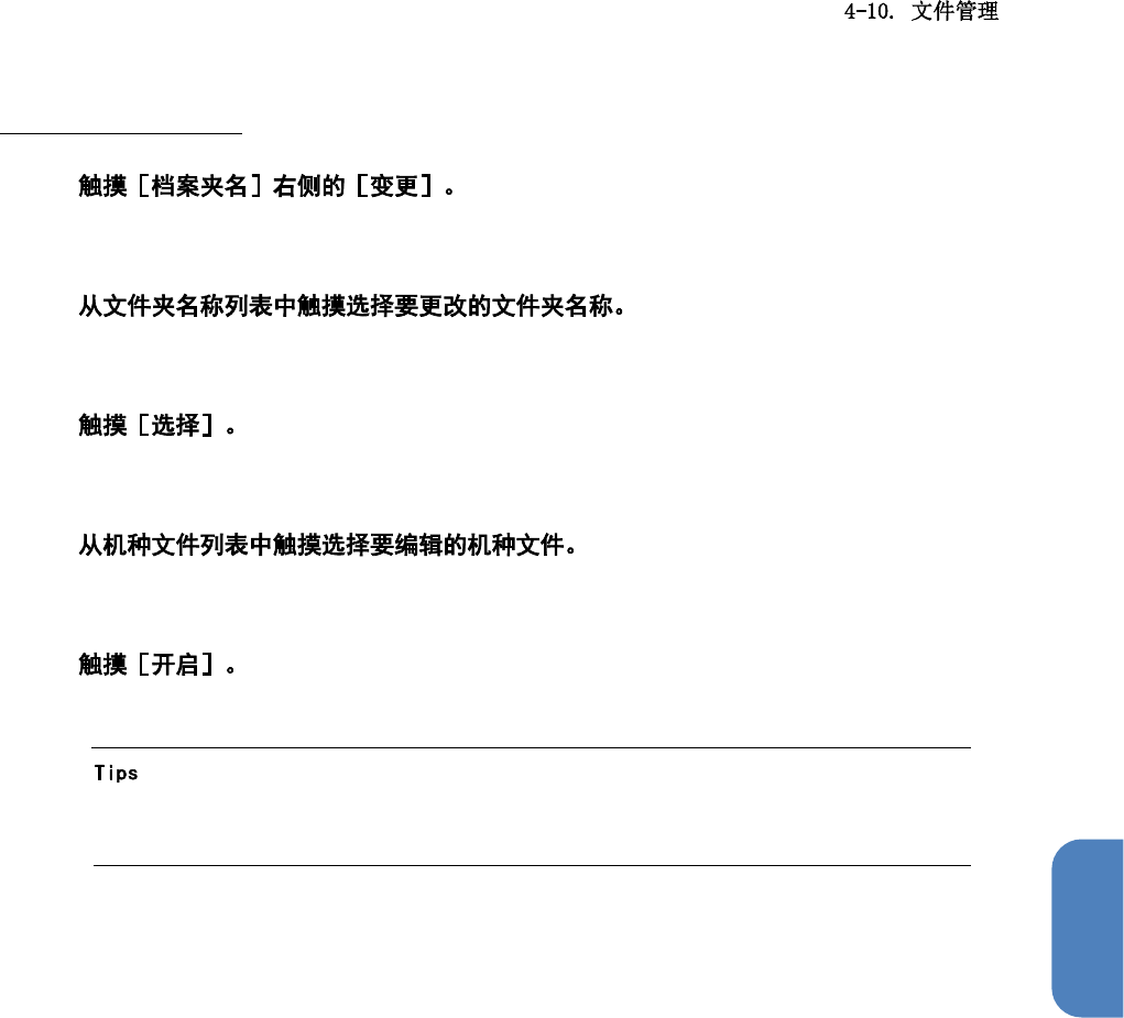 第 4 章 操作篇 • 在文件操作画面 中,可 新建文件夹用于文件 管理。可用于生产的 机种数据的文 件夹名 称可在机器设定 中更改 。 n 在文件操作画面 中触摸 [档案夹名]右侧的 [变更]后显示。 (a) 档案夹名 选择文件 夹名称列表中 显示的文件夹 后,将显示路径。 输入文件夹名称 。 (b) 新规作成 用[档案 夹名]中输入 的名称,创建 新的文件夹。 (c) 打开按钮 打开文件夹名称 列表中 选择的文件夹,在文 件夹名称列…