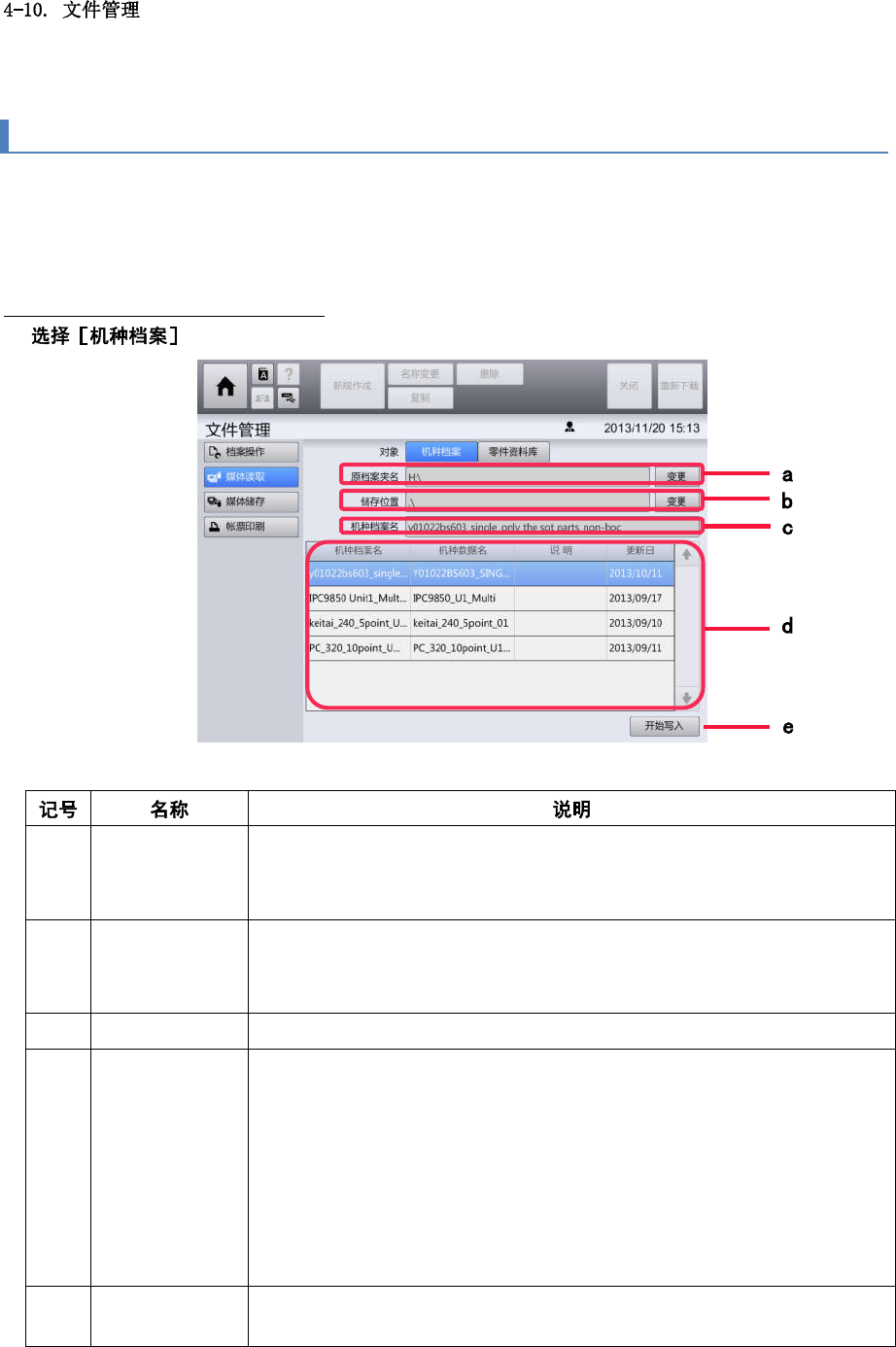 (c) 机种档案名 显示在机种文件列表中选择的机种文件名称。