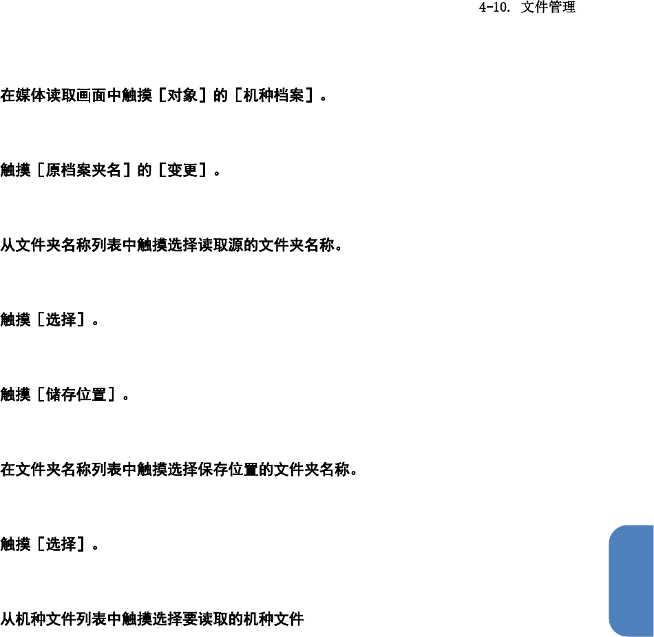 第 4 章 操作篇 4 1 [机种档案]变 为蓝色 选中状态,在机种列 表中显示文件。 2 显示[文件夹变更]对 话框。 3 选择的文件夹名 称将变 为蓝色选中状态。 4 关闭[文件夹变更]对 话框,媒体读 取画面的[原 档案夹名]中将显示 选择的文件夹 名称。 5 显示[文件夹变更]对 话框。 6 选择的文件夹名 称将变 为蓝色选中状态。 7 关闭[文件夹变更]对 话框,媒体读 取画面的[储 存位置]中将显示选 择的文件夹名 称。 8…