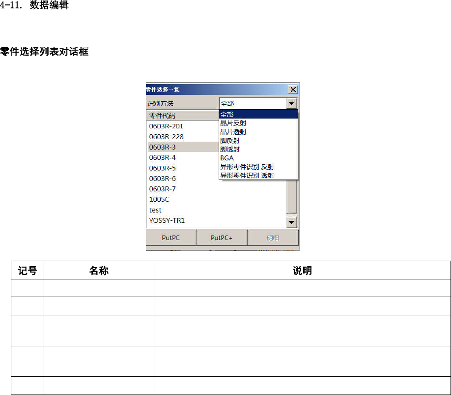 第 4 章 操作篇 在[数据编辑] 菜单画 面中触摸[表 A ],显示[零件选 择一览]对话 框。 (a) 识 别方法 从下拉列 表中选择[零 件代码]列表 中显示的零件识别方 法。 (b) 零 件代码列表 显示通过 [识别方法] 中选择的识别 方法识别的零件数据 列表。 (c) P utPC 显示安装数据时 ,可将 [零件代码]列表中 选择的零件代码追加 到 安装数据中。 (d) P utPC+ 显示安装数据时 ,可将 [零件代码]列…