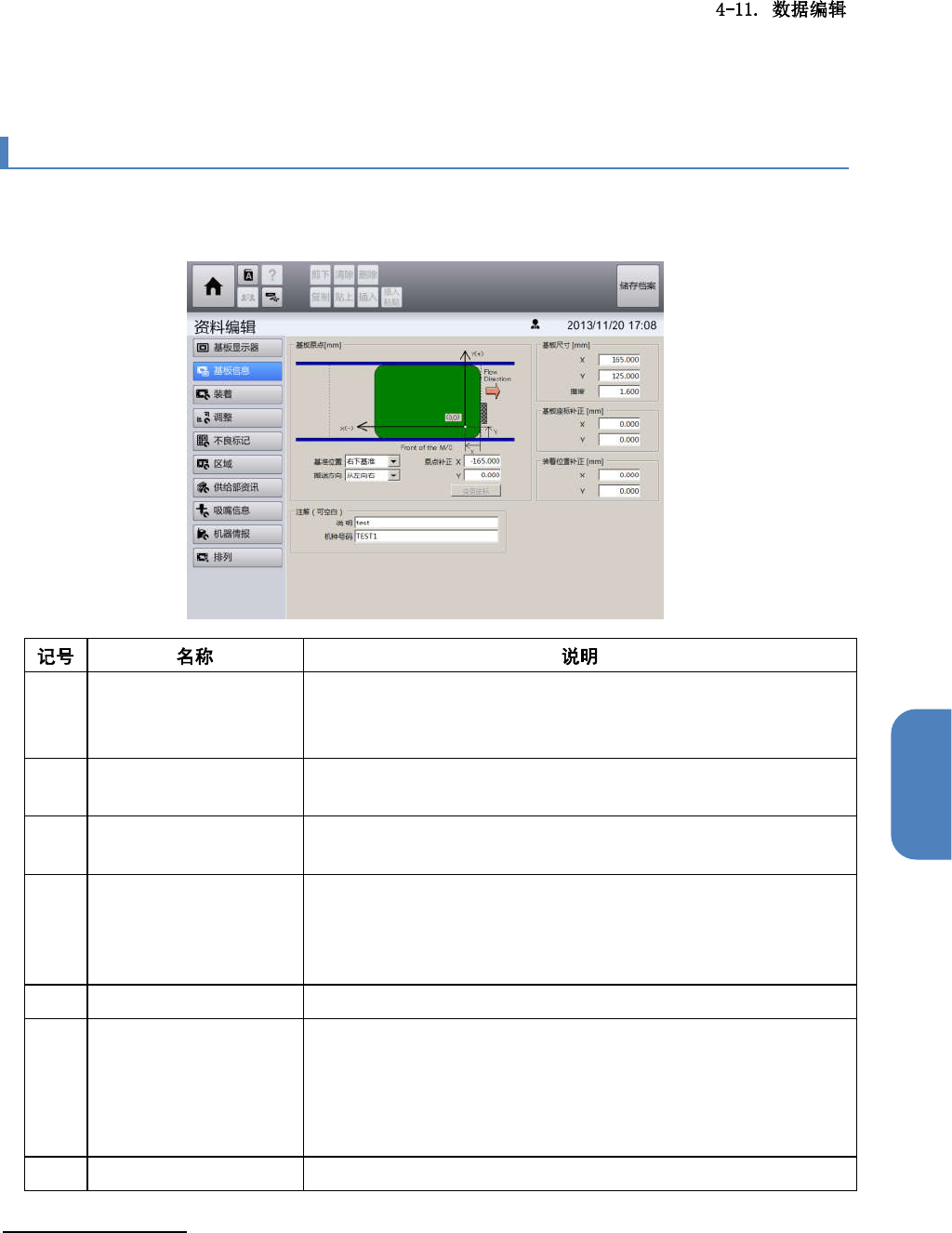 触摸[数据编辑]画面左侧的子菜单面板中的[基板信息],显示[基板信息]画面。