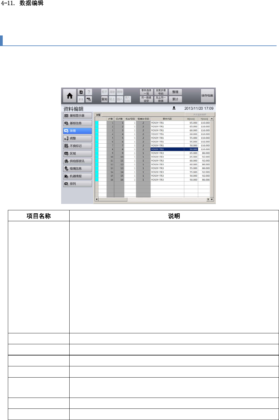 可显示各步骤的零件代码,安装坐标,供给部,部件名,吸嘴索引,吸附顺序,装着顺序并编辑。