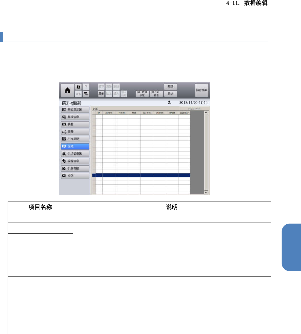 触摸[数据编辑]菜单画面左侧的子菜单面板中的[区域],显示[区域]画面。