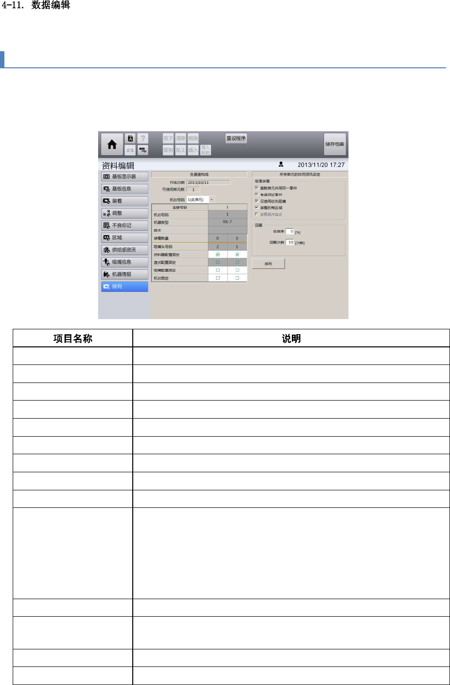 第 4 章 操作篇 4-11-11. 数据排列 输入排列所需的 设定。 通过排列,可自动生 成生产效率较高的机 种数据。编辑 排列结果并创建机种数据 时,可通过模拟 确认节 拍时间的结果。 触摸[数据编辑]菜单 画面左侧的子 菜单面板中的 [排列],显示[排 列]画面。 可使用单元数 显示连接使用的 电子零 件安装机台数。 线名 数据中使用生产 线信息 时,显示生产线名称 。 作成日期 显示执行排列或 模拟的 日期时间。 总工作时间 […