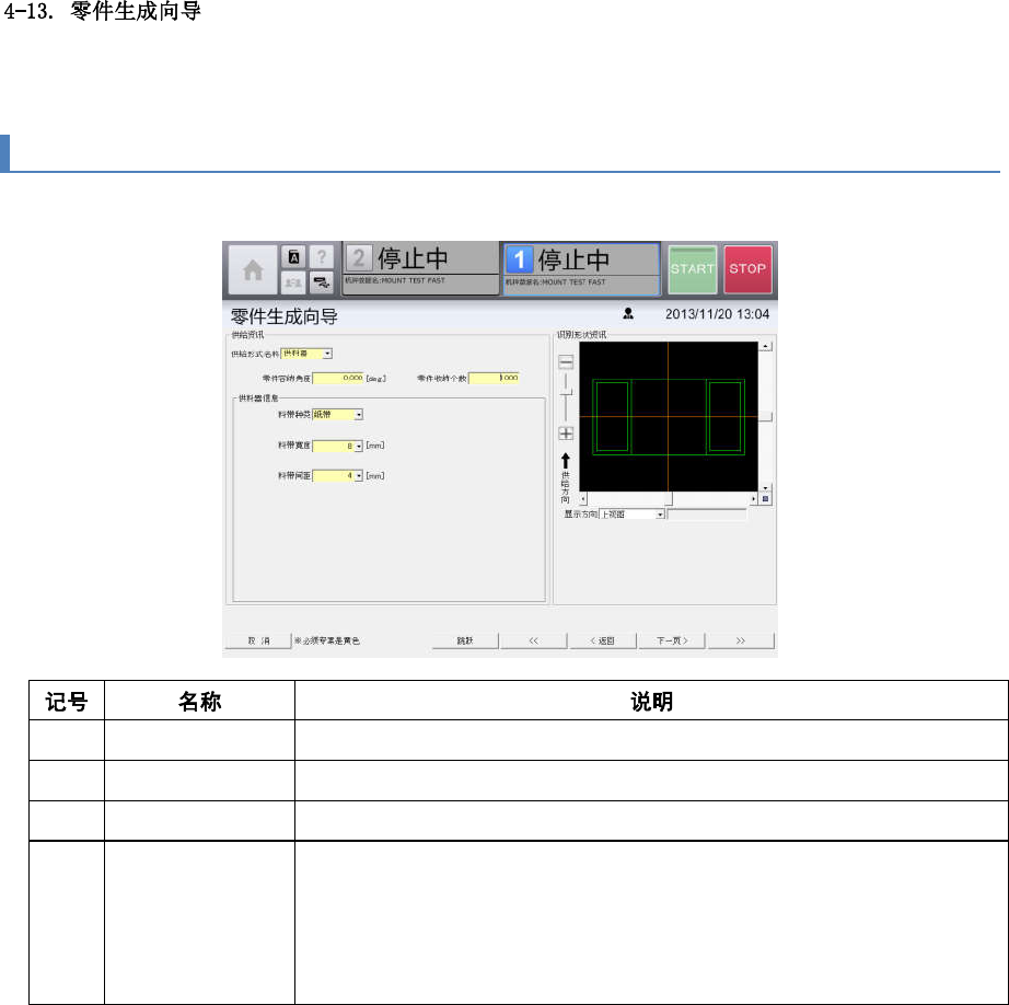 第 4 章 操作篇 4-13-2. 供给信息画面 画面上显示为黄 色的单 元格为必填项目。 (a) 供给形式 从下拉列表中选 择零件的供给 形态。 (b) 零件容纳 角度 输入零件的存放 角度。 俯视零件,顺时针旋 转方向为正方向。 (c) 零件收纳 个数 输入 1 个新零件供 给装置中存放的零件个 数。 (d) 供料器信 息 从下拉列表中选择与零 件带式 供料器相关的信息。 • 料带种类:从[ 纸带] ,[塑胶带]中选择 料带的材质。…
