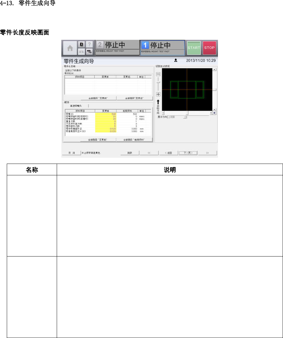 第 4 章 操作篇 4 在定位的过程中 使用 设定脚 设定是否排列引 脚集合 。 通常为选中。但 以下情 况下取消选中。 • 发生识别错误。 • 引脚集合重叠。 • 主体内存在引脚 集合。 高精度模式 设定是否在高精度模式 下测量 引脚前端。 背面装着检出 吸附零件时,设 定是否 检测零件的背面安装 (上下反转吸附的状 态)。 • 检查内侧装着: 选中后 ,将检测背面安装的 零件。 • 正常吸附状态: 指定零 件表面的亮度。零件 表面在…