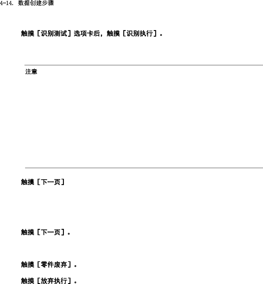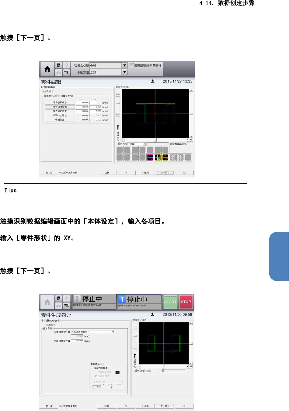 第 4 章 操作篇 21 选中[识别角度]的[ 吸着偏离测试 ]后显示吸附 的偏移,选中[零件 旋转测试]后显示旋 转 吸附零件后利用 角度识 别的状态。 • 识别数据的验证 请从两 方面进行,一是吸附 中发生零件偏移时的 识别稳定性, 二是在 任意角度识别时 的识别 稳定性。 • 验证与零件偏移 相关的 稳定性时,选中[吸 着偏离测试],在[ 旋转角度范围 ]和 [旋转刻度角度 ]中输 入合适的值,然后触 摸[识别执行]。此时,会 受…
