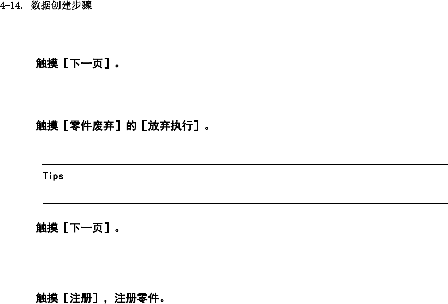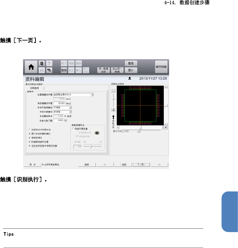 第 4 章 操作篇 23 显示吸附,废弃 画面。 24 为了从吸嘴上取 下识别 到的零件,进行废弃 动作。 • 本操作无法跳过 。 25 显示注册信息确 认画面 。 触摸[表示明细],显 示注册零件的 详细信息。 26 结束零件生成向 导,返 回零件编辑画面,零 件注册完成。 260