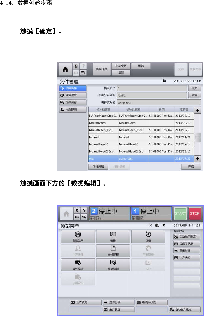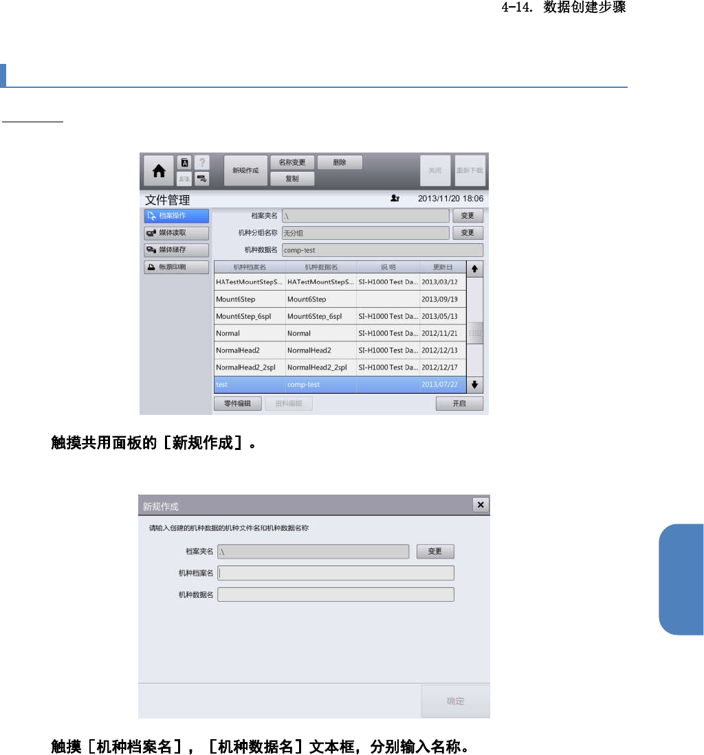 第 4 章 操作篇 3 确定输入的机种 文件名 和机种数据名称并变 为显示状态后,关闭 [新规作成] 对话框,显示文 件操作画面。 4 显示数据编辑画 面。 288