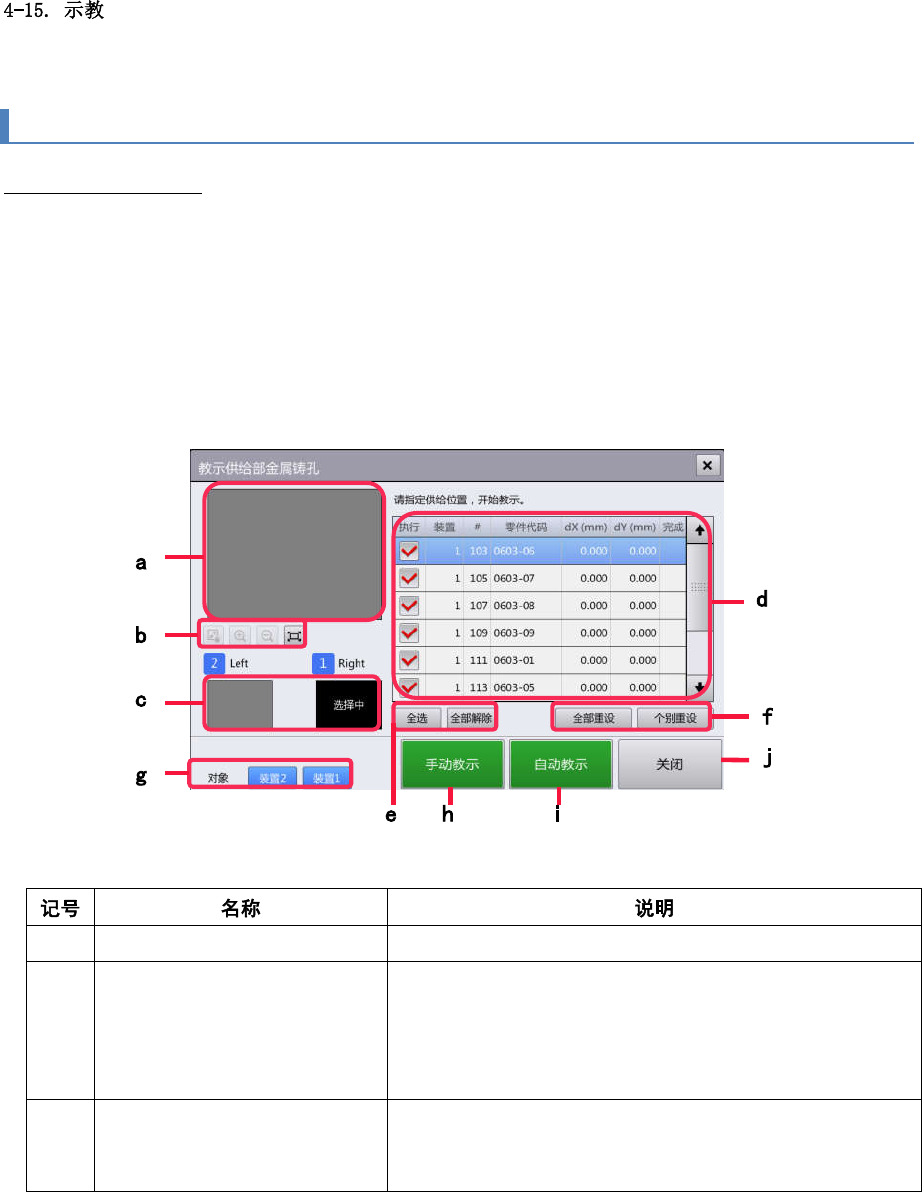 第 4 章 操作篇 4 (d) 供给位置 列表 列表显示正在进 行零件 核对,更换作业的带式供料器,通 过勾选来选择执 行示教 的供给位置。 • 自动:选中要执行金属 铸孔示 教的供给部。 • 装置:显示有零件供给 的装置 。 • # :显示供给位置编 号。 • 零件代码:显示 零件代 码。 • dX (mm) , dY (mm) :显示金属铸孔示教结 果的补 正 值。 • 完成:通过 OK/NG 和背景颜色显示金属铸 孔示教 的 结果…