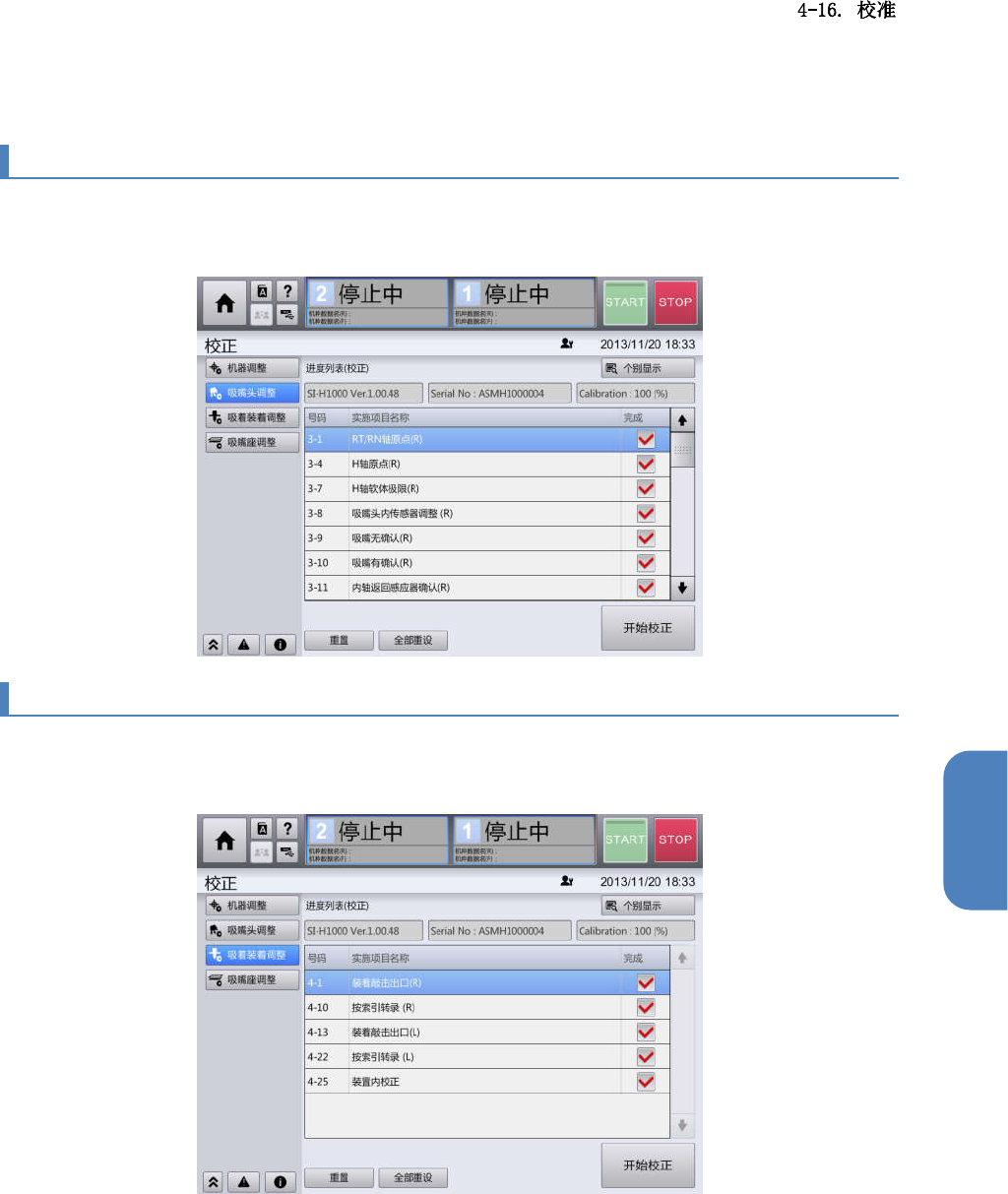 第 4 章 操作篇 4-16-6. 吸嘴座调整 在吸嘴座调整画 面中, 可对本机的吸嘴头进 行相关的校准。 触摸校准画面左 侧的子 菜单面板中的[吸嘴 座调整],显示[吸 嘴座调整]画 面。 4-16-7. 安装精度补正 在安装精度补正 画面中 ,可对本机的吸嘴头 进行相关的校准。 触摸校准画面左 侧的子 菜单面板中的[装着 精度补正],显示[ 装着精度补正 ]画面。 要进行安装精度 补正, 需要用付费选购件。 付费选购件无效时, 不显…