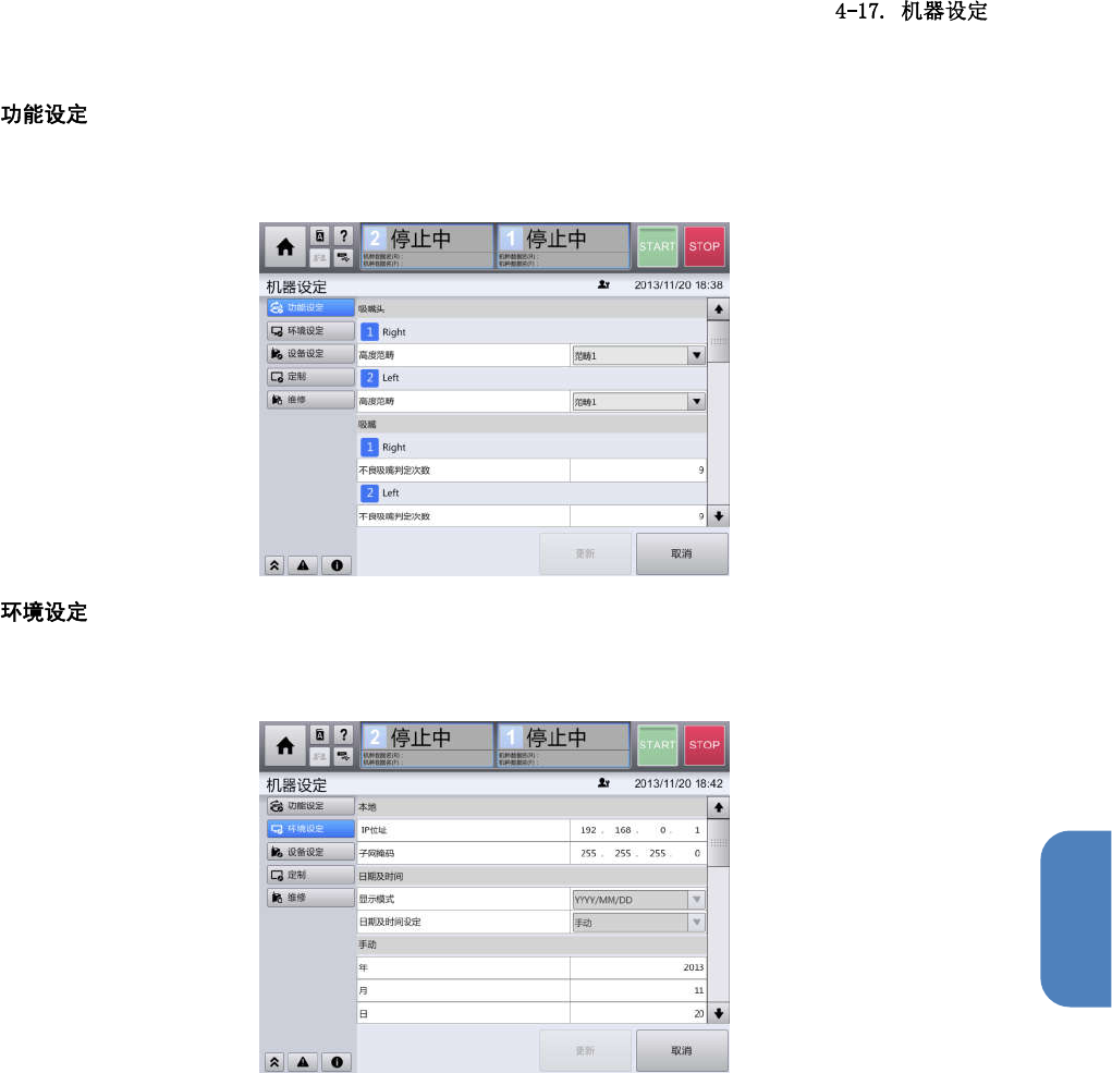 第 4 章 操作篇 4 在功能设定画面 中,可 更改自动生产相关的 功能。 触摸机器设定画 面左侧 的子菜单面板中的[ 功能设定]后显示。 在环境设定画面 中,可 对与自动生产没有直 接关系的功能进行设 定,如选择日 期的显示格式等。 触摸机器设定画 面左侧 的子菜单面板中的[ 环境设定]后显示。 343