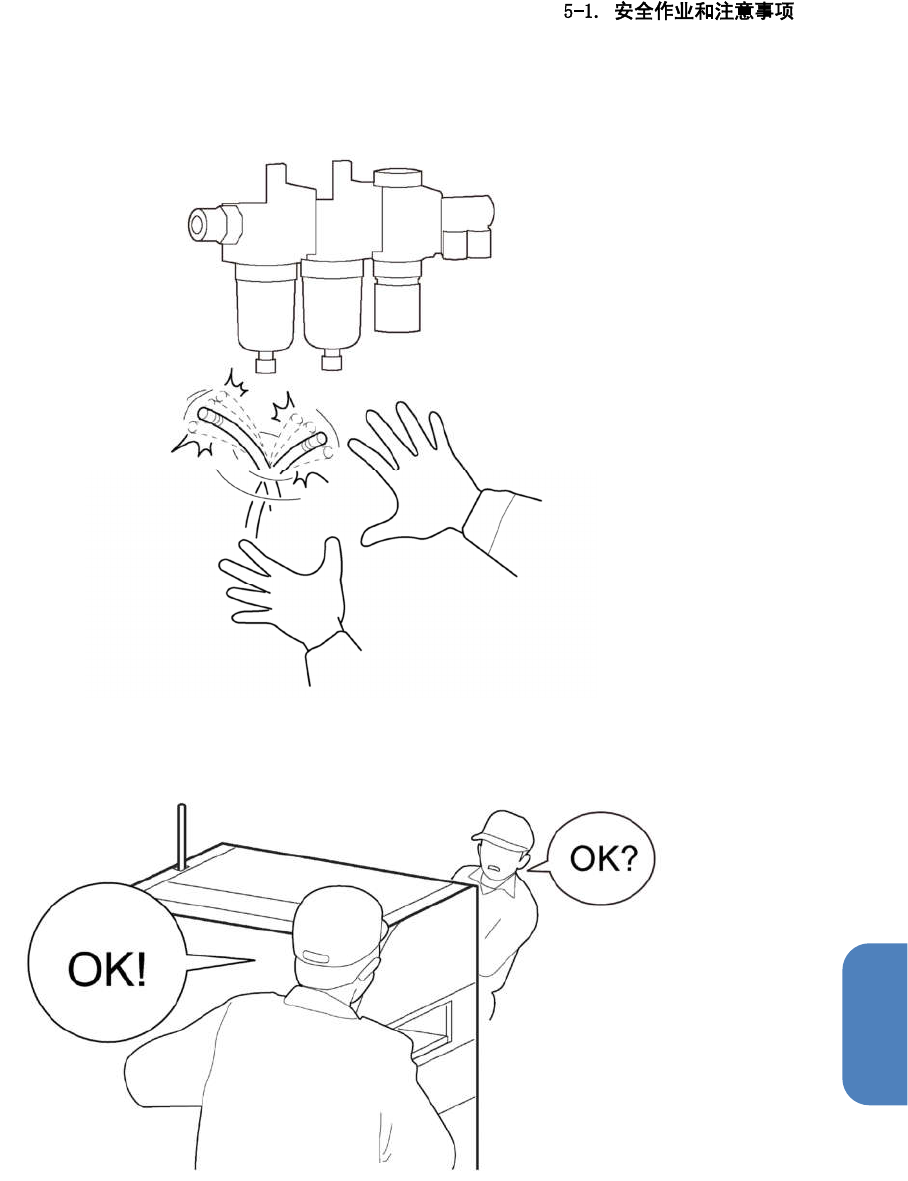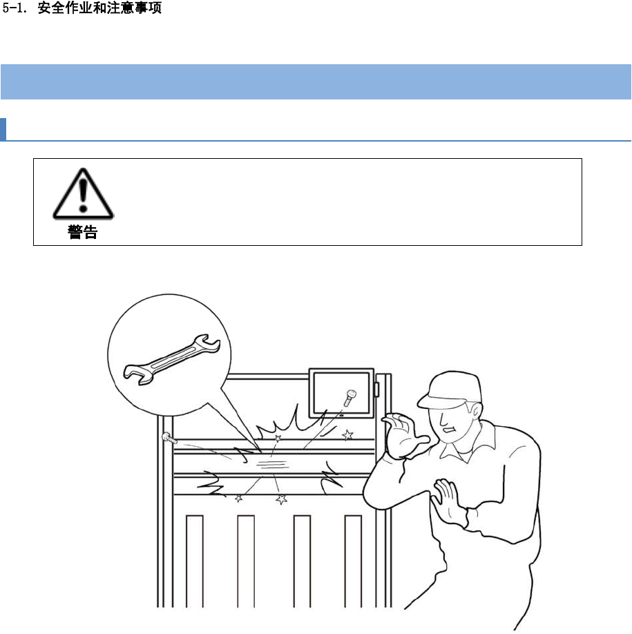 第 5 章 维护篇 5-1. 安全作业 和注意事项 5-1-1. 保养检查时的安 全作业和注意事项 n 安全管理责任人 员作为 监督责任人员不在场 时,禁止进行本机器 的 检查,修理,调 整,清 理以及上油等保养工 作。 n 在本机可动作的 状态下 进行维护作业时,除 作业员以外禁止操作 。 • 请勿将工具,夹 具和零 件等放置在机器可动 范围内。 2