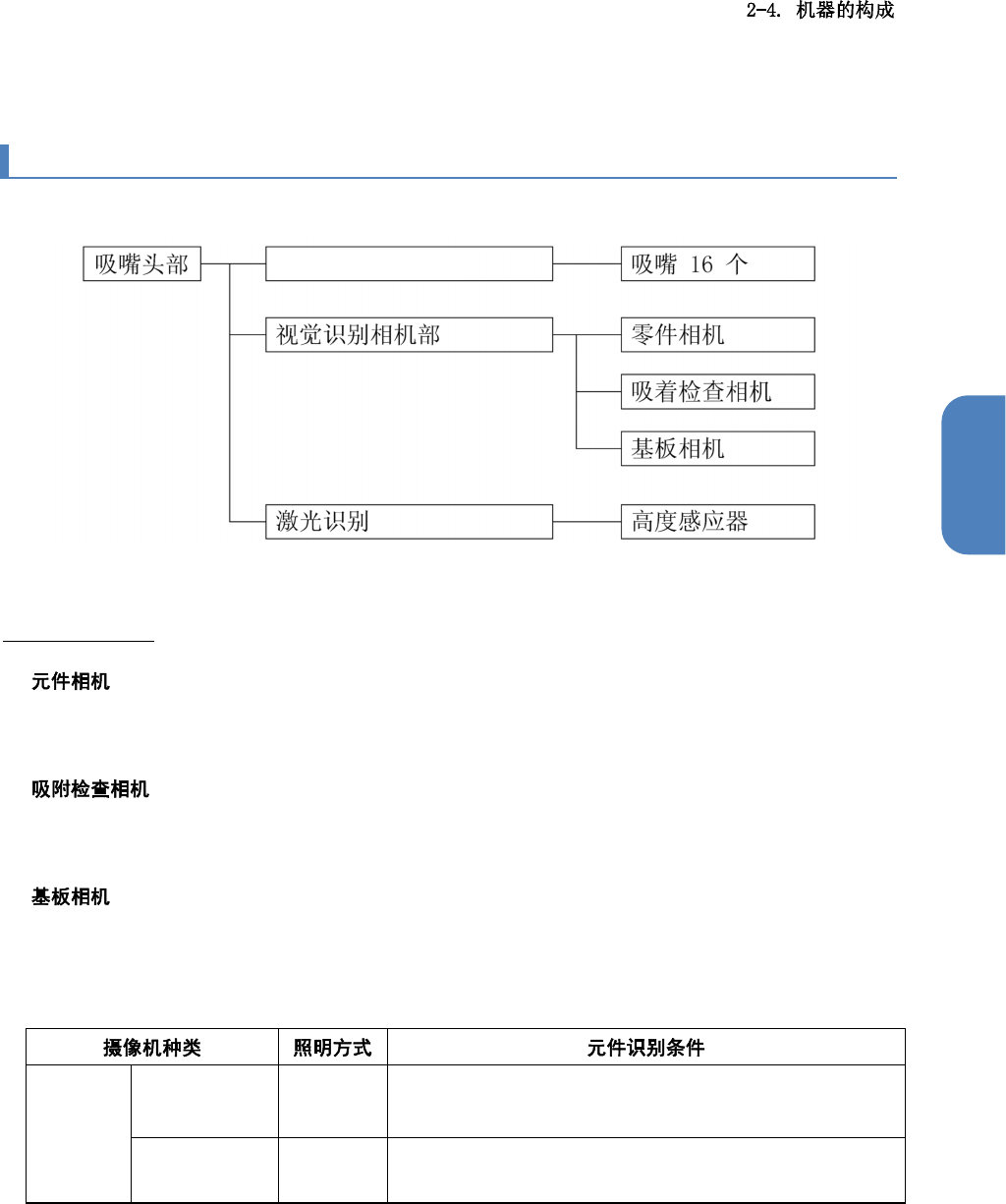 第 2 章 系统概要 2-4-7. 吸嘴头部的构成 吸嘴头的构成如 下。 视觉识别相机部 n 为了正确安装, 对吸附 元件进行确认的相机 。元件相机安装于在 XY 上移动的安装吸 嘴头。利用此 相机,在安装吸 嘴头移 动的时候来识别元件 。 n 吸附元件时,为 了检查 吸附状态,从元件侧 面进行识别,来检查 元件高度的相 机。可检查立式吸 附。采用透射照 明。 n 本相机可进行基 板姿势 补正,带式送料器吸 附位置补正,识别确 定元件安…