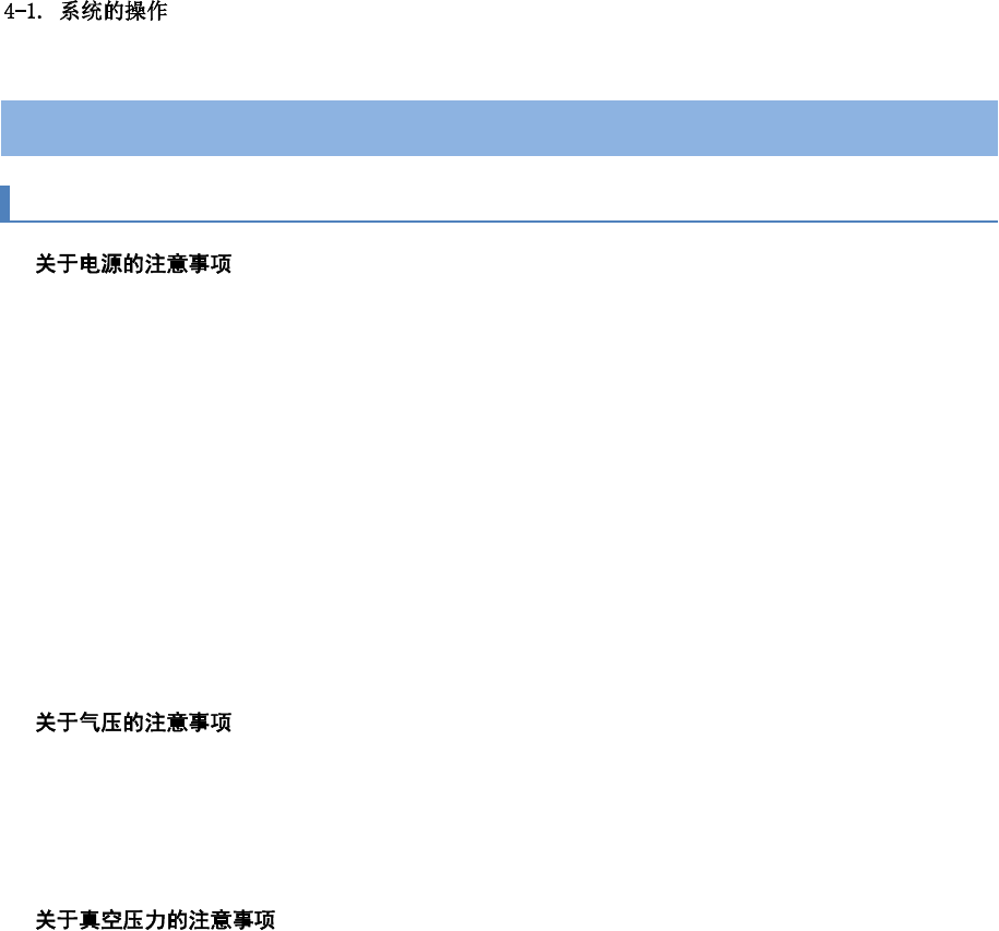 第 4 章 操作篇 4-1. 系统的操 作 4-1-1. 接通电源前的注 意事项 n • 关于电源电缆 本机电源使用三 相 AC200 V ±10% (50 Hz/60 Hz) 。额定视在 功率约 3.3 kVA 。电源电缆请务必使 用线芯截面积为 3.5 mm 2 × 4 芯 (AW G 12) 以上的电缆。 • 关于防干扰对策 本机控制系统采 用微机 控制方式。必须采取 措施防止干扰混入电 源或发生电源 脉动等。安装本机 前,请充分…