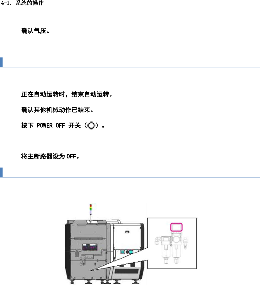 第 4 章 操作篇 4 请从本机正面上 方的小 窗确认 S UPPLIED AIR 的显示为 0.5 MPa 以上。 4-1-3. 切断电源时的步 骤 切断电源前请确 认以下 项目。 1 2 3 执行自动关机, 本机结 束运行。 4 4-1-4. 空气的切断步骤 请打开正面右下 方的盖 子(右下方的台车盖 子),逆时针方向旋 转空气供给减 压阀的手柄,切断控 制供 给。紧急时,请 拔下工 厂总压缩空气管。 4