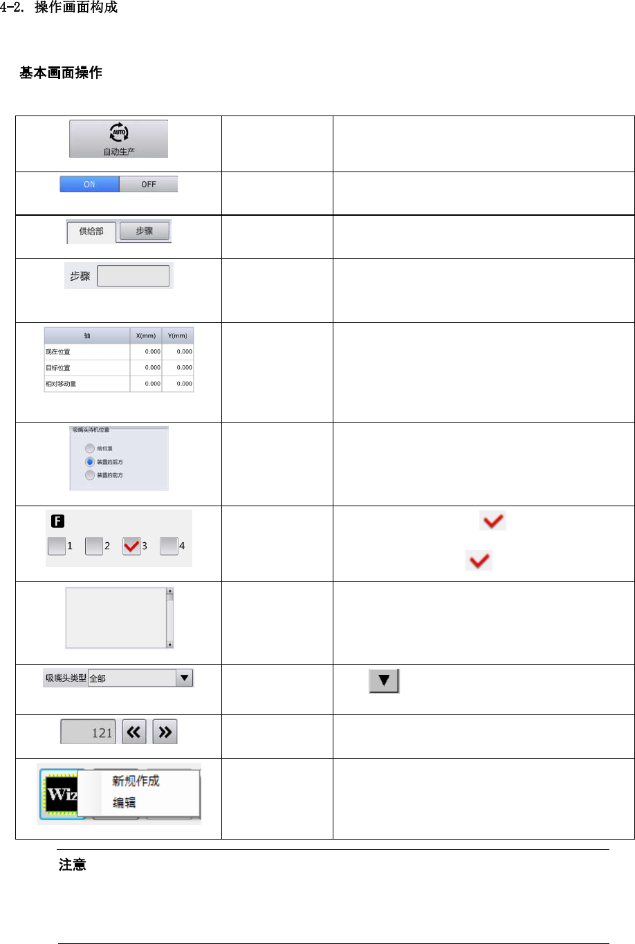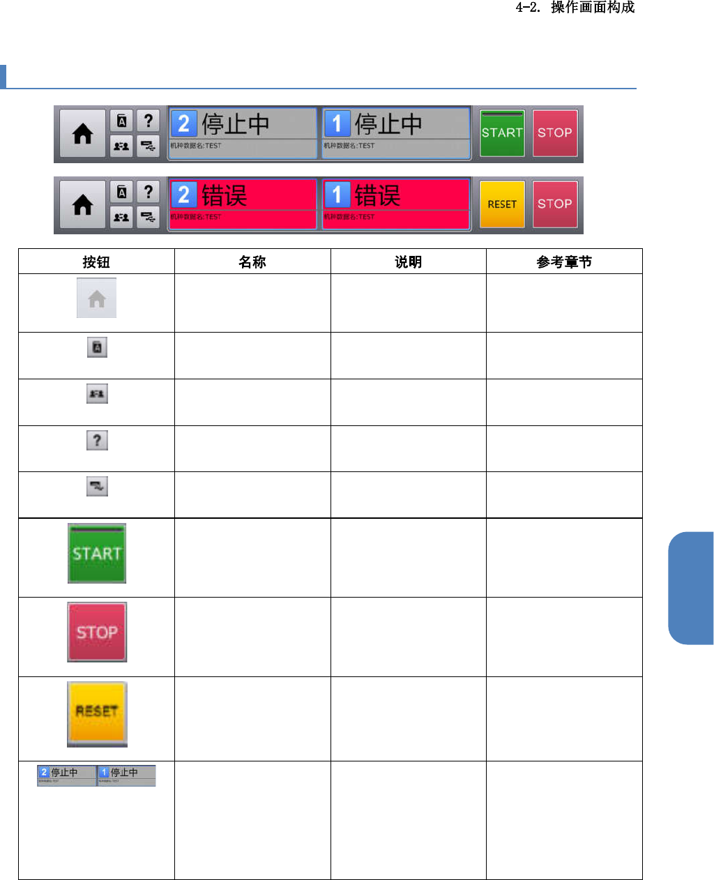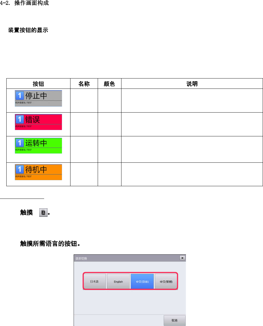 第 4 章 操作篇 4 4-2-1. 共用面板 Home 按钮 显示[顶部菜单]画 面。 4-2. 操作画面构成 语言 切 换显示语言。 4-2-1. 显示语言的切换 用户 切 换用户级别。 4-2-1. 切换用户 帮助 显 示操作说明书。 4-2 -1. 帮助的显示 USB 存储设备 安全取下 USB 存储设 备。 4-2-1. 移除 USB 存 储设备 开始 长按 1 秒以上,开 始 自动运转。 - STOP 停止自动运转( 步骤停…