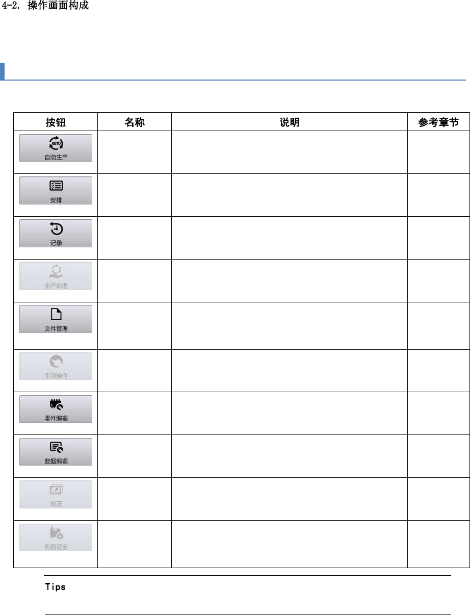 第 4 章 操作篇 4 4-2-4. 访问记录栏 在记录栏显示过 去所选 子菜单中的最近 8 个项目和记录 。触摸显示的按钮, 直接移 动到该功能画面。 根据用户级别分 别注册 显示的子菜单,如果 用户级别发生变更, 将切换为该用 户以前访问的记录。 4-2-5. 自定义栏 显示各用户注册 的子菜 单按钮。触摸显示的 按钮,可显示该功能 的画面(快捷 键功能)。 在此以[自动生 产]的 子菜单[吸嘴头状况 ]的注册方法为例进 行说明。 …
