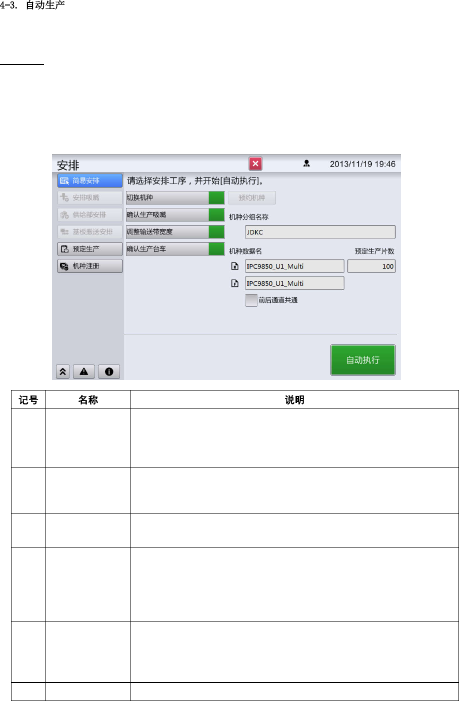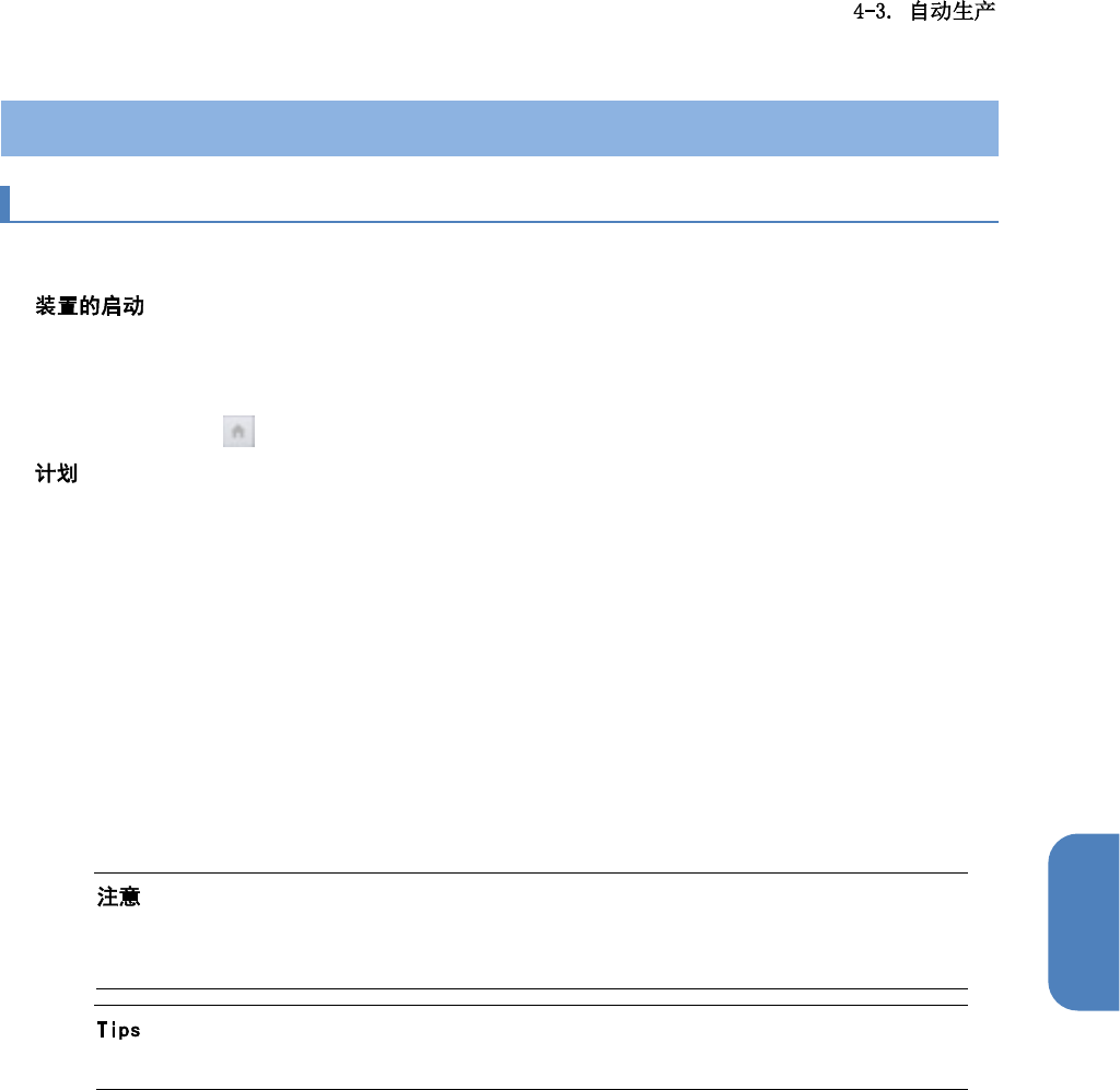 第 4 章 操作篇 4 4-3. 自动生产 4-3-1. 生产准备 要进入自动生产 ,需要 做好以下准备。 n 接通电源,启动 本机。 显示[自动生产]菜单 。 要显示主菜单, 请触摸 。 n 开始自动生产前 做好计 划,使本机各部位做 好准备。计划分为简 单计划和不同 作业的单独计划。 有关简单计划, 请参阅 下述说明。 有关单独计划的 详情, 请参阅“ 4-5. 计划”。 主要的计划作业 有以下 事项。 • 机种切换 • 搬送输送带…