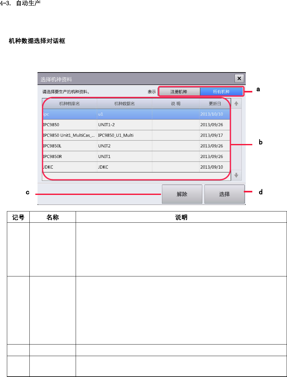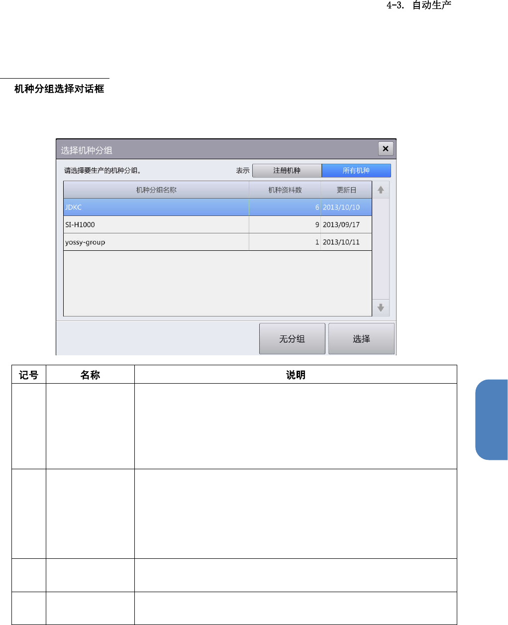 第 4 章 操作篇 4 简单计划对话框 的详情 n 选择 / 解除自动生产 时使用的机种分组。 触摸机种分组名 称的文 本框,或触摸右端的 图标,将显示[选择 机种分组]对 话框。 (a) 表示 选择要在画面中 显示的 机种分组名称列表的 种类。 • 注册机种:显示 包括通 过机种注册注册的机 种数据在内的机种分 组名称列表。 • 所有机种:显示 所有的 机种分组名称。 未注册机种时, 仅[所 有机种]有效。 (b) 机种分组名称列 表…