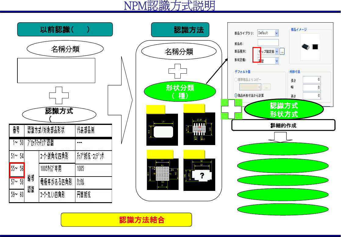 自由的組合 複数指定可能 必要的追加指定 追加開発が容易 75種的追加機能装備 CM ・固定抵抗 ・ TR ・ QFP ・ PLCC ・ BG A ・ 4 箱型 腳型 球型 複合型 NPM REF.) CM+BM NPM 認識方式説明 以 前 認 識 ( ) 認識方法 部 so - y | Default v ] 部品 5 打列 : / 形状定 : ) c 名稱分類 I ? , , 固定抵 ; ] 口 14 外形寸法 3 3 G…