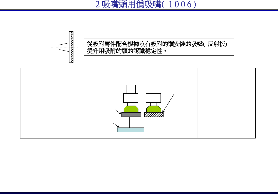零件尺寸 用途 1006吸嘴 備考 Nozzle 部品 1006吸嘴 33mm以上 2吸嘴之中 安裝1個 2 吸嘴頭用僞吸嘴 ( 1 006 ) 從吸附零件配合根據沒有吸附的頭安裝的吸嘴 ( 反射板 ) 提升用吸附的頭的認識穩定性 。