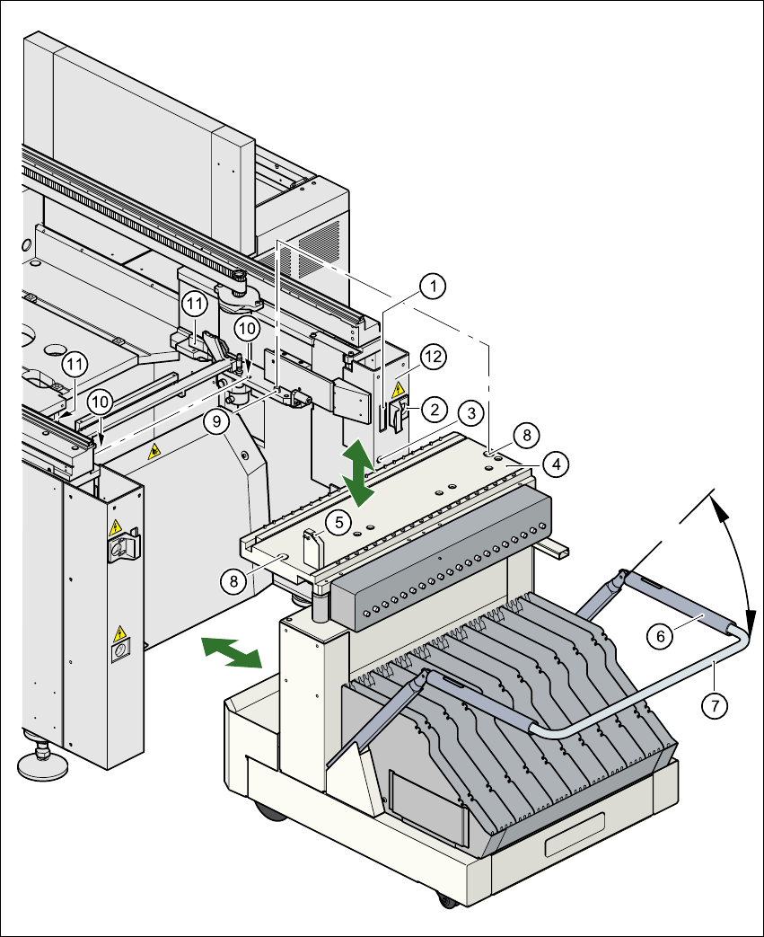 Æ Greifen Sie niemals in die Spalte zwischen den BE-Wagen und dem Automatenständer (Pos. 1